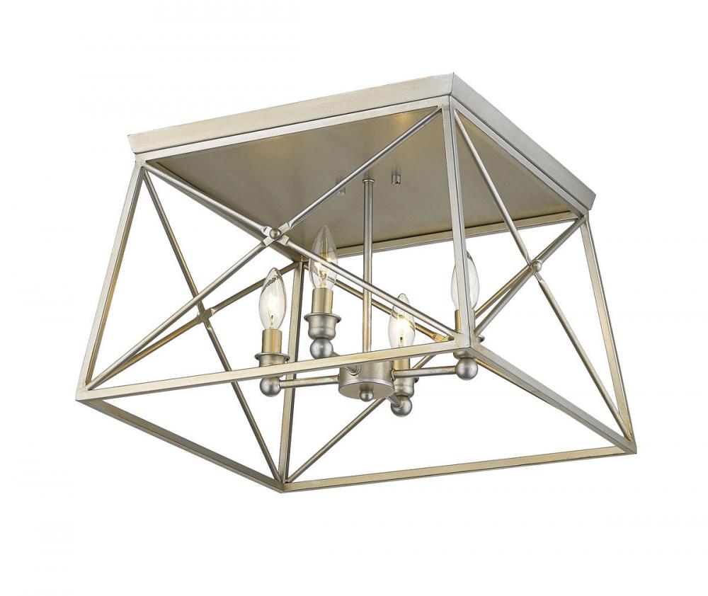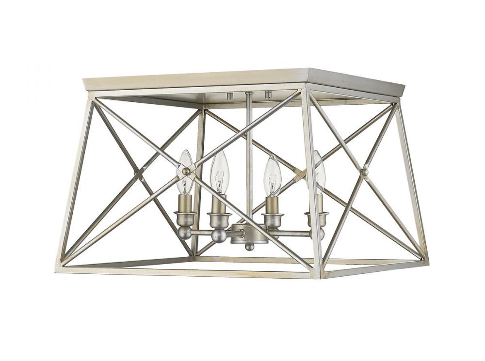 Indulge in an exercise of geometrics and stunning interior d?cor, adding this four-light flush mount ceiling light to a main living space. Charm guests with a fixture reflecting an old style trestle silhouette with a cage metal frame sporting a gorgeous Antique Silver finish, and a charming candelabra bulb mount peeking through.