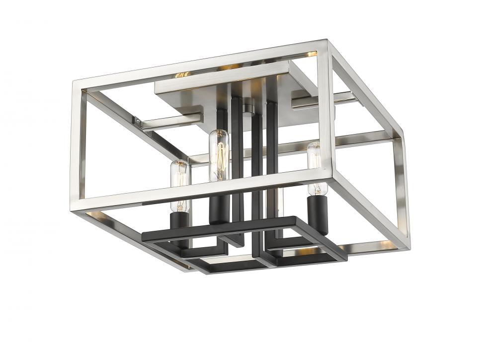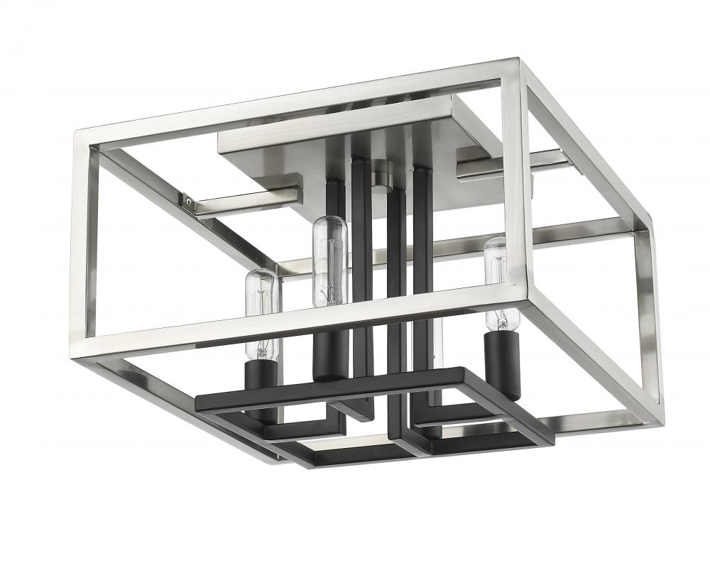 All eyes divert upwards and take in the dynamic look of this brushed nickel and black finish four-light flush mount ceiling light. An open frame with clean lines offers a stylish home for candelabra-style bulb bases and showcases a metropolitan architectural motif.