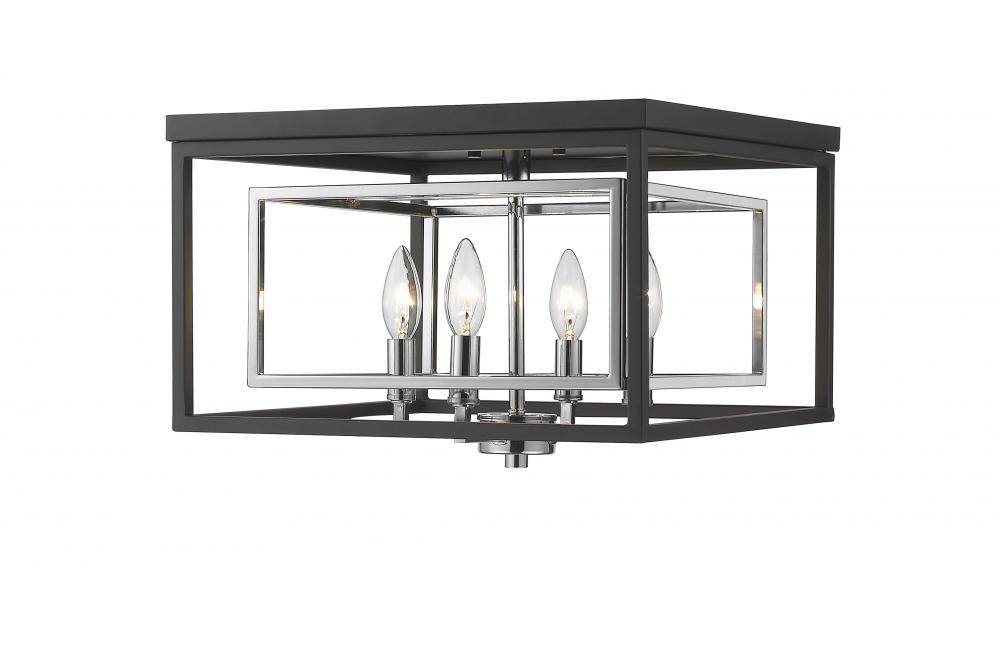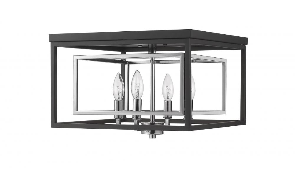 This contemporary four-light flush mount design takes advantage of open layered cubes for a fresh geometric twist. Modern chrome and matte black finishes bring a visually striking sense of stark beauty to any metropolitan city inspired space.