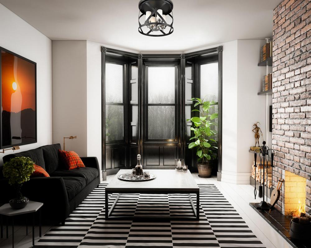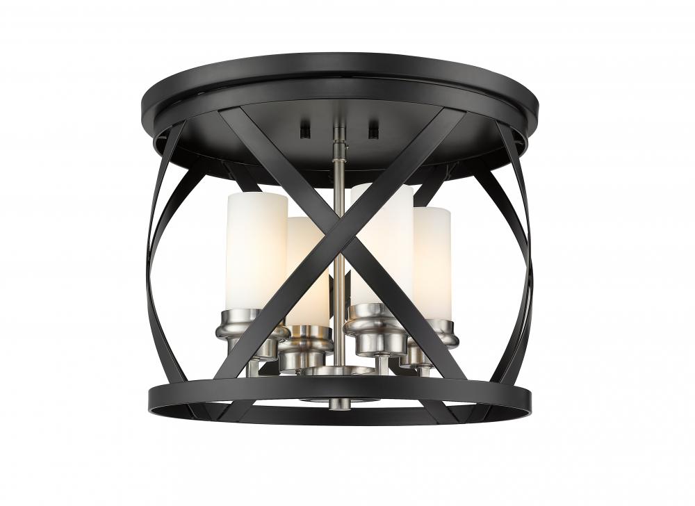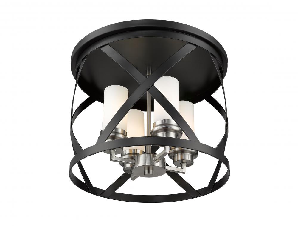 Enhance your home lighting with the eclectic charm of this two-tone four-light flush mount light. It features a combination matte black and brushed nickel finish in a stylish round design highlighted by an X-cross pattern. You and yours will enjoy the immediate upgrade in ambiance this light brings to any hallway, bedroom, dining room, or living room.