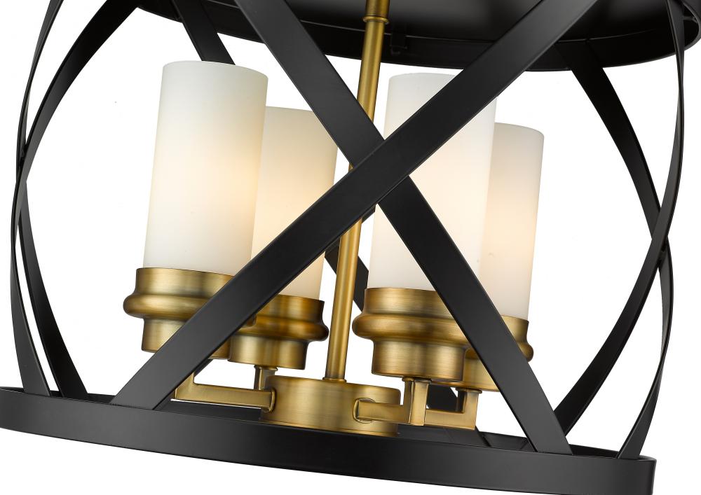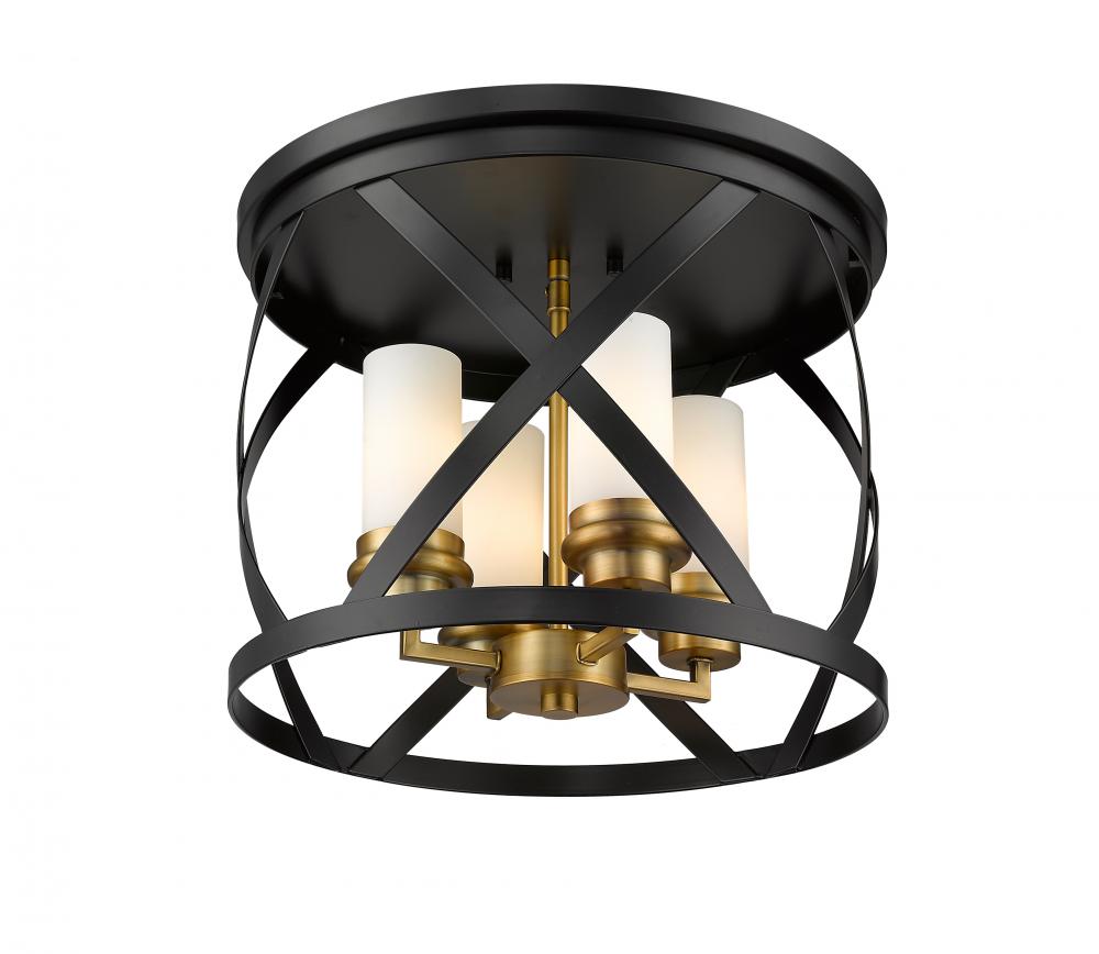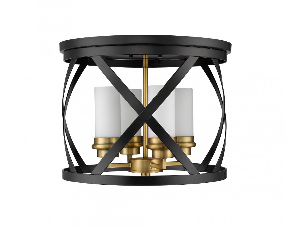 Enhance your home lighting with the eclectic charm of this two-tone four-light flush mount light. It features a combination matte black and olde brass finish in a stylish round design highlighted by an X-cross pattern. You and yours will enjoy the immediate upgrade in ambiance this light brings to any hallway, bedroom, dining room, or living room.