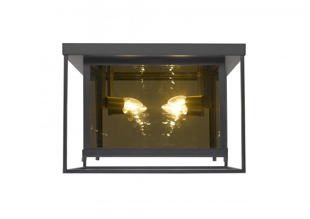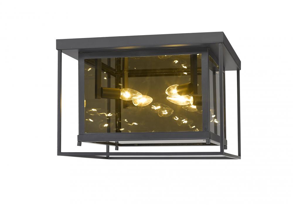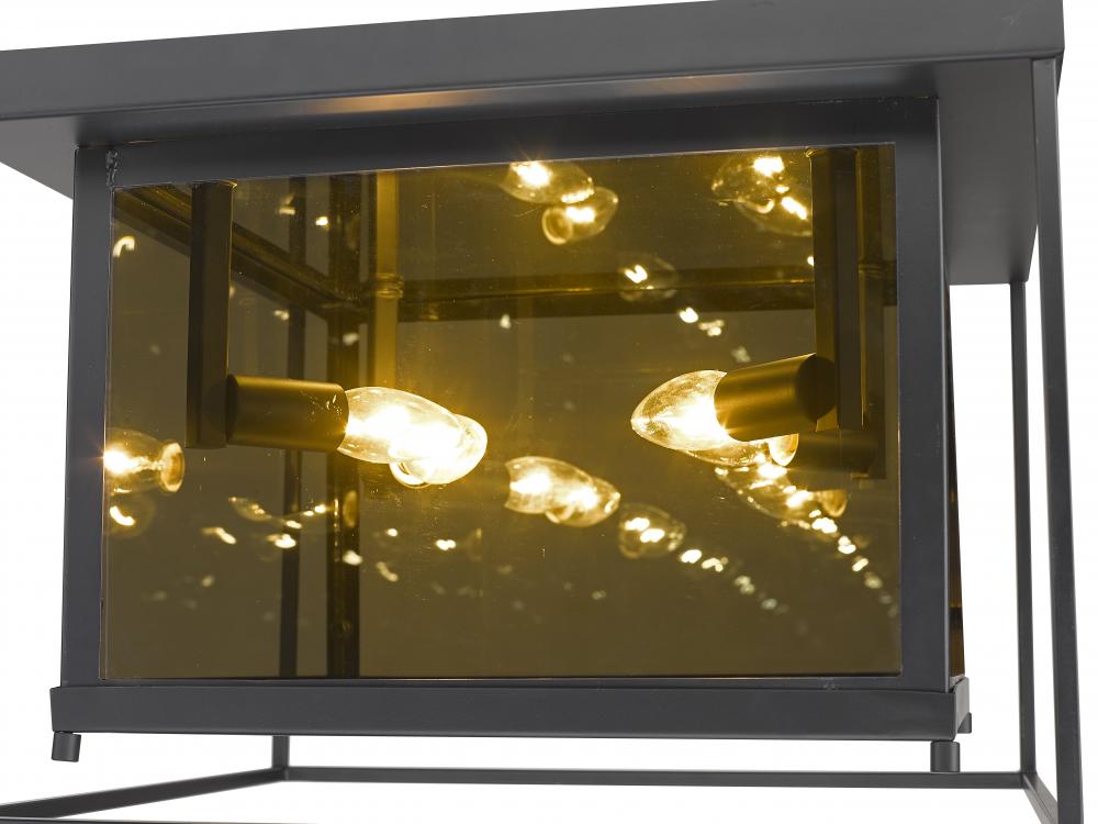 Choose this decadent contemporary four-light flush mount light for its chic blend of steel and mirror, and a geometric linear silhouette that updates modern living areas including dining rooms, foyers, and hallways. A double frame made from misty charcoal finish steel joins both clear and smoke glass to deliver a soothing, atmospheric aesthetic with plenty of inspiration. Candelabra bulb mounts create an opportunity to change up the motif and fit into transitional spaces.