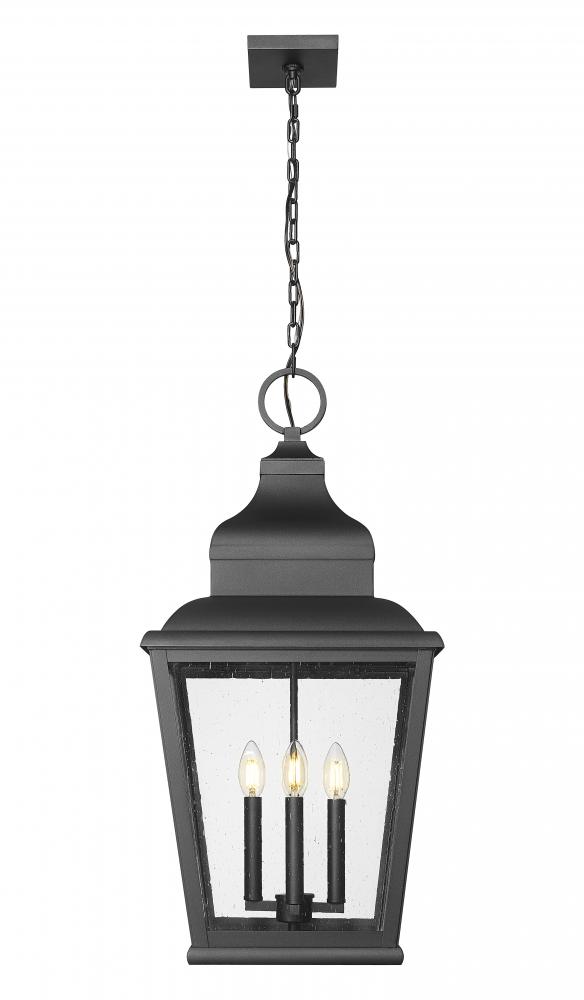 Plenty of strong illumination originates from this four-light outdoor chain mount ceiling fixture, a superb choice for customizing lighting on covered porches, back patios, and outbuildings. A softly bold sand black finish coats aluminum framing with a tapered silhouette and excess detail delivering style. Clear seedy glass panels reveal interior candelabra-style light bulb mounts that invite bulbs and offer light levels through dimming features.