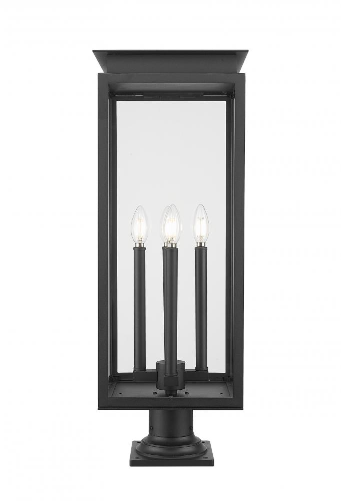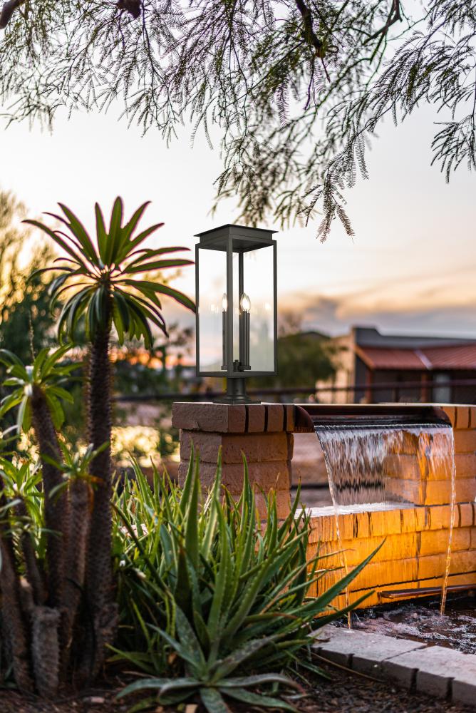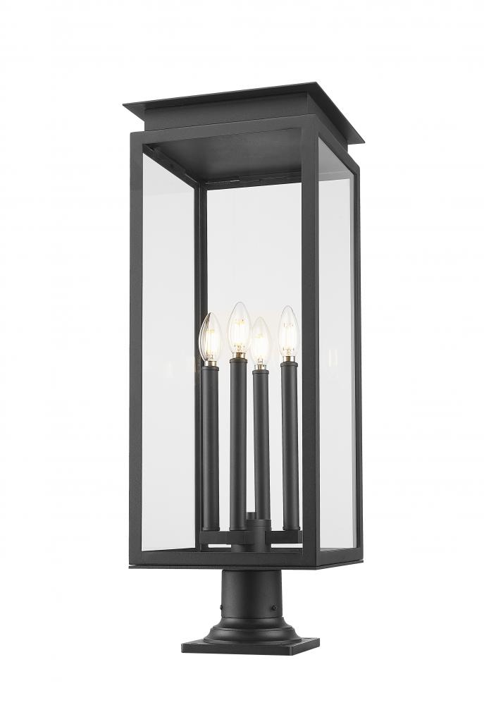 A classic silhouette is inspired by an old world lantern to bring stylish flair to this transitional four-light outdoor pier mount light. Its coastal black finish pairs with glass panes for bright illumination and a fresh, crisp look that stands up to the elements. The lantern is complete with a stepped cap and trim, creating a luxurious touch that adds wonderful curb appeal.