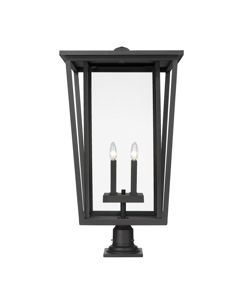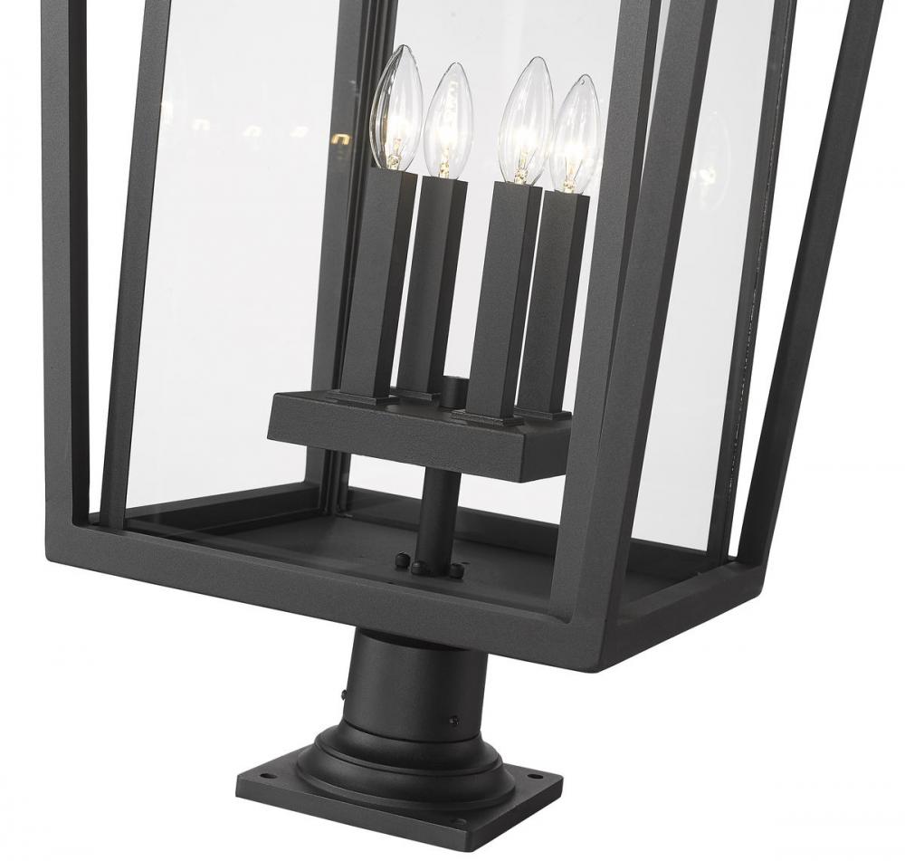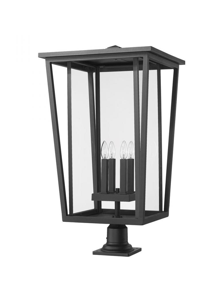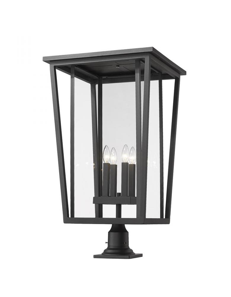 Garden and walkway spaces welcome the distinguished look of this four-light outdoor pier mounted fixture from the Seoul collection. Specially cut clear glass panels work into an angled housing unit crafted of black finish aluminum, adding sophistication and fully modern style. This post light emphasizes the custom design of tasteful landscaping.