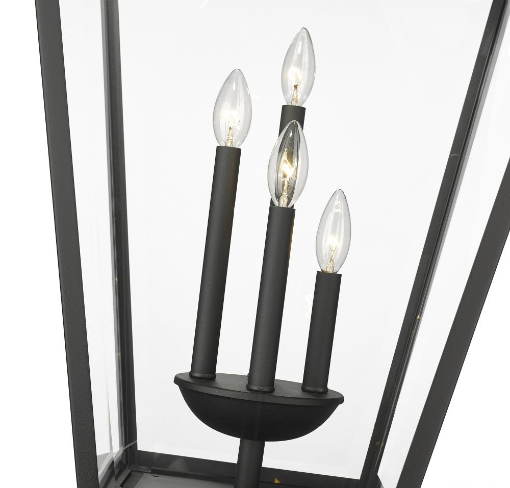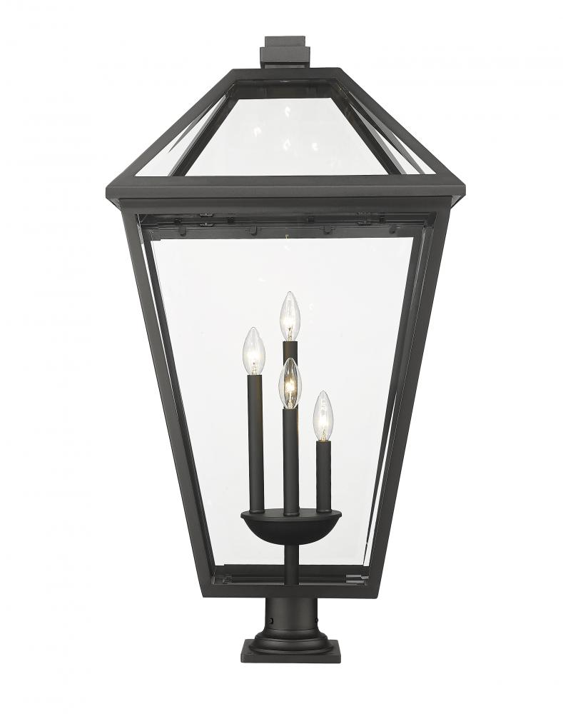 Dignify a custom exterior space with the village-inspired Talbot four-light outdoor post mounted fixture and its industrial motif that makes a bold statement. This light and pole duo offers a slick black finish stainless steel frame with dividing panels of clear beveled glass.