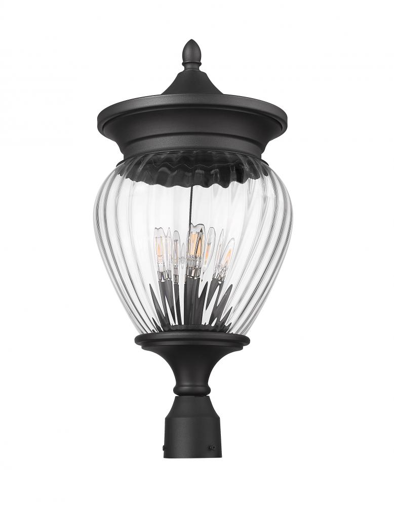 Make a fashion statement in an exterior space as this four-light outdoor pier-mount fixture lights up decks, patios, and landscaped areas. Aluminum framing showcases a Coastal black paint finish that brings ornate flair to a teardrop silhouette enhanced with an alluring ribbed glass shade. Candelabra lights offer the perfect hint of vintage allure to this dimmable garden lighting fixture.
