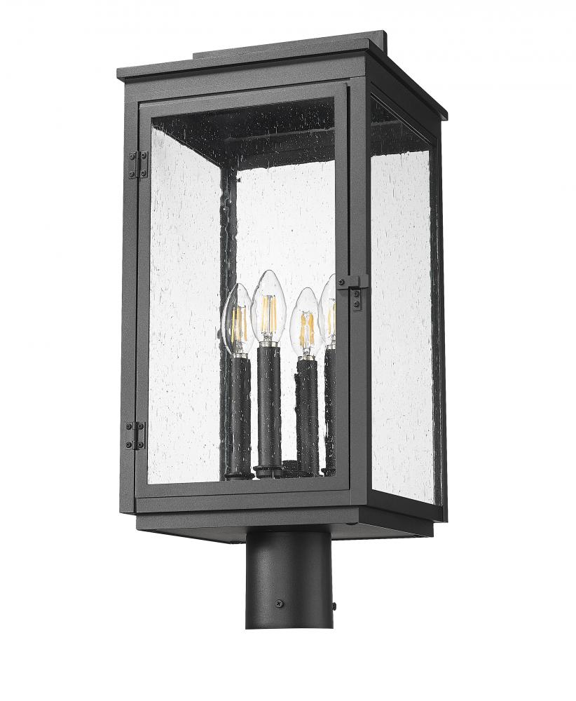 Standing tall in sand black and wrapped in rippling clear seedy glass, this four light outdoor post mount fixture brings serious presence. Four candle-inspired lights glow from within, casting a warm halo that feels like evening magic. The crown and handle detail give it a timeless elegance. It?s the finishing touch that turns any path into a moment.