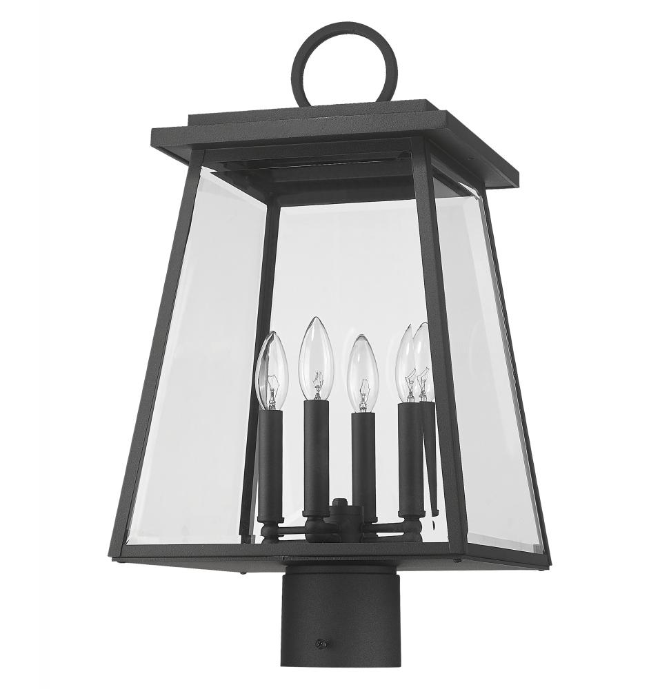 Take a stroll back in time to an old village maritime theme, with a modernized effect that works well in all spaces. From the Broughton collection, this four-light outdoor post-mount fixture offers construction of sleek black aluminum and clear beveled glass panels on its lantern-style shade. Romantic candelabra bulb mounts tell the tale of a storied aesthetic.