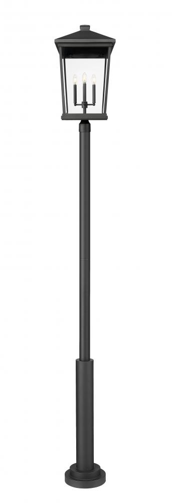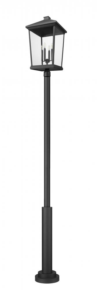 Soft, romantic village-inspired aesthetics lend a timeless look to this four-light outdoor post mount fixture. From the Beacon collection, this fixture features a house-like silhouette made of matte black finish aluminum with clear beveled glass panels. A charming candelabra-style bulb mount unit reinforces the nautical village flavor of this exceptional fixture.