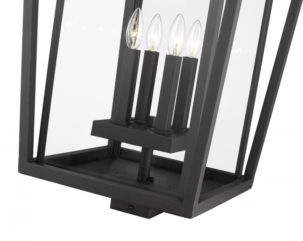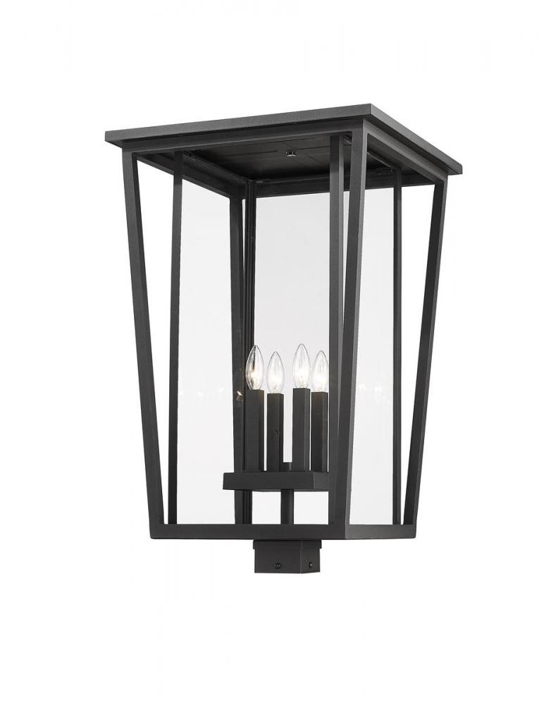 Angled sections merge to create an optically pleasing energy, adding a striking look to this four-light outdoor post-mount fixture. Top a post of your choice with this elegant hybrid traditional and modern fixture crafted of black finish aluminum with cool slanted features. Specially cut clear glass panels finish its tasteful design.