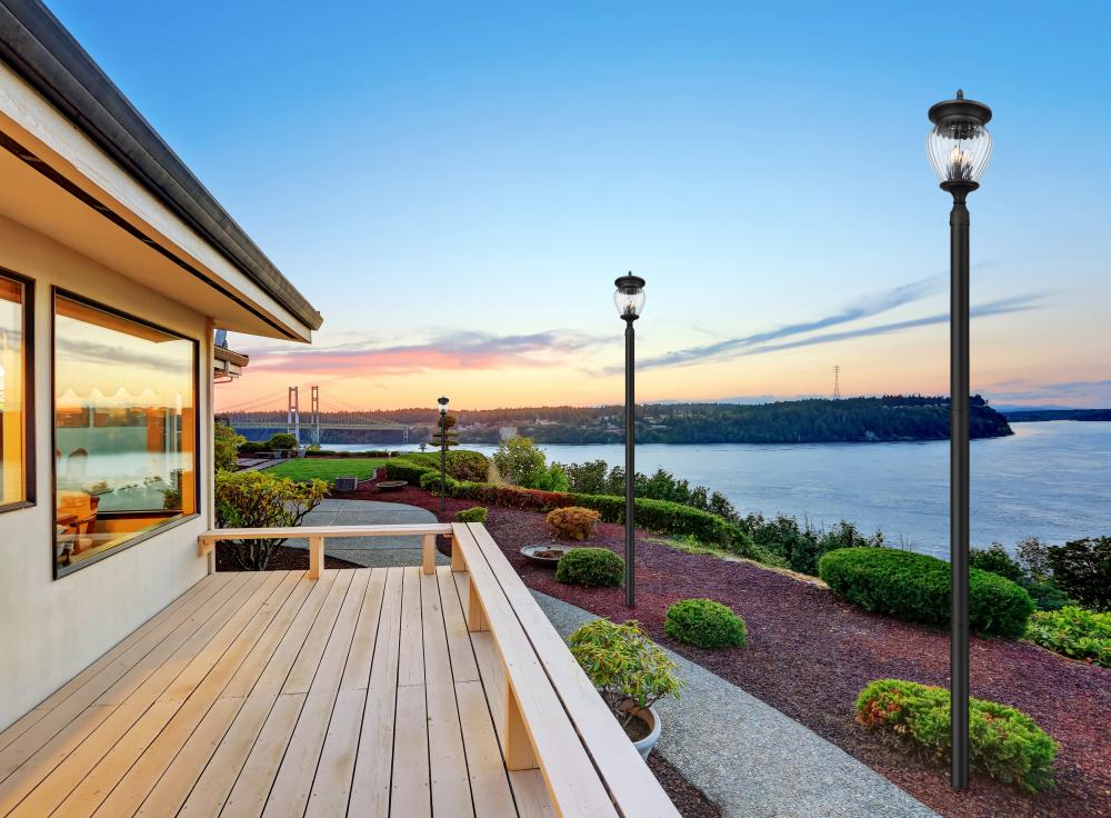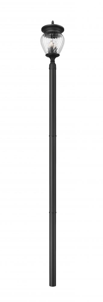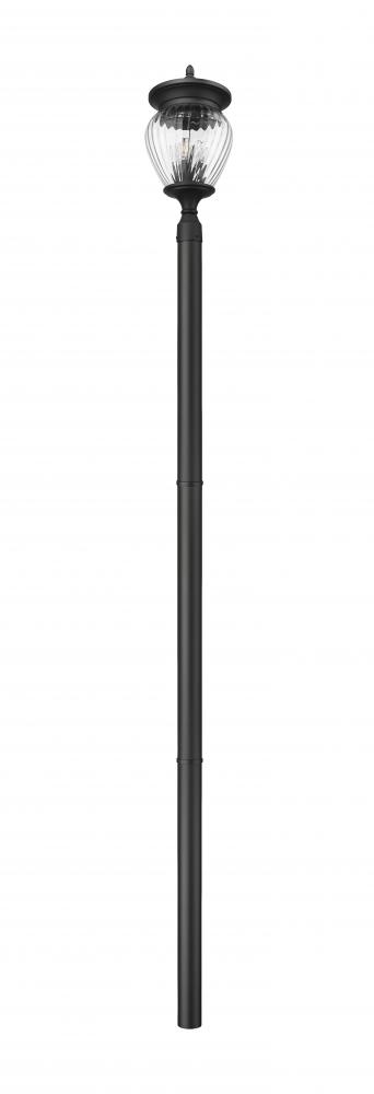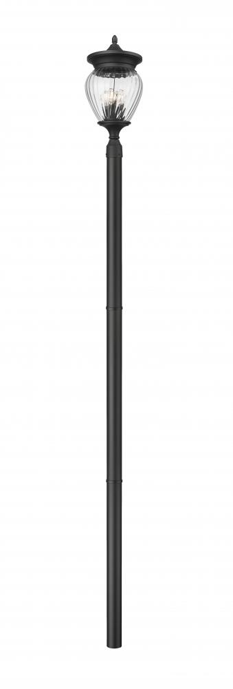 Sophisticated and custom-influenced outside spaces deserve decadent lighting. This four-light outdoor post-mounted fixture is a complete unit featuring a pole with clean lines and ornate accents surrounding a clear ribbed glass shade. Featuring a smooth Coastal black paint finish, its dramatic impact and romantic style cannot be underestimated.