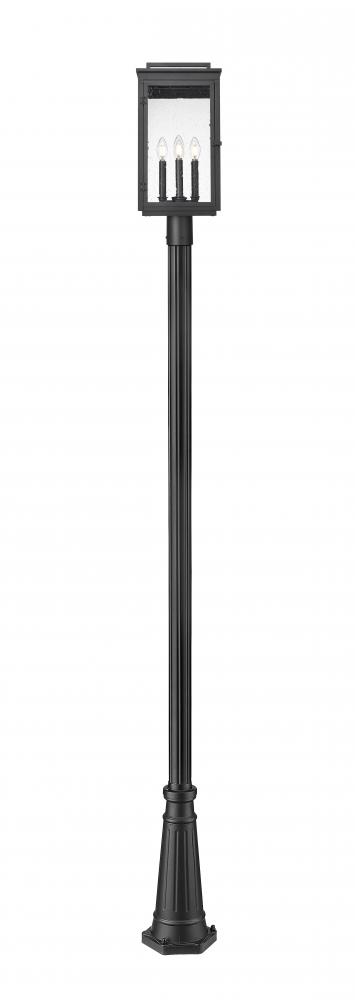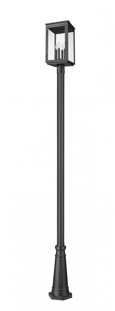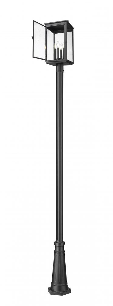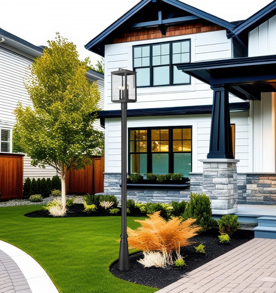 Seed glass encloses a rectangular lantern on this Mission four-light outdoor post mount fixture. Perfect for pathways and excellent curb appeal, it sports a sand black finish and decorative details that infuse character and charm into your exterior decor.