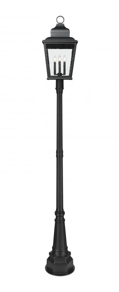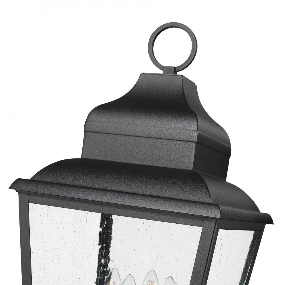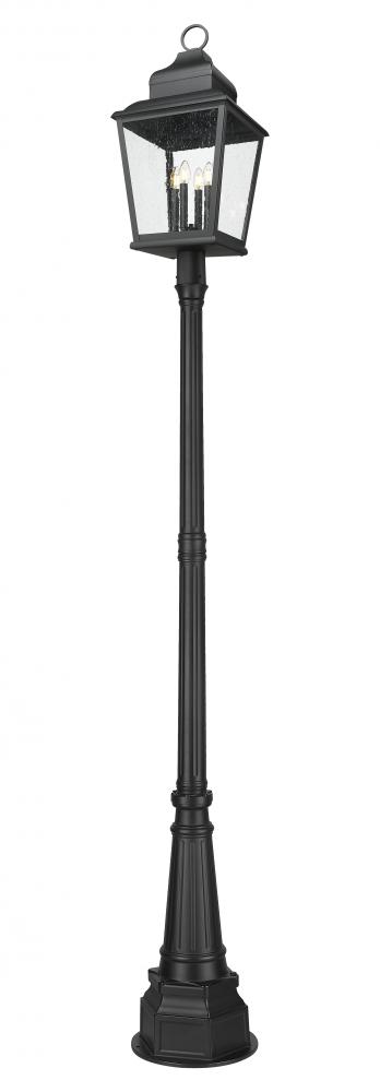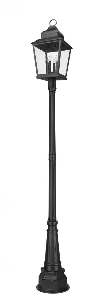 Choose this four-light outdoor post mount fixture for maximal illumination in a large yard space or pathway. Made of sand black finish aluminum, its lantern-inspired framing is treated to ornate accenting, with clear seedy glass panels infusing a bit of romance. Interior candelabra-style bulb holders glow with lighting thats dimmable to conform to round-the-clock conditions.
