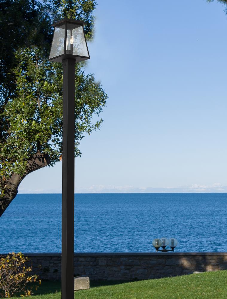 Transform an exterior walkway or garden space with a tribute to old village nautical fare. From the Broughton collection, this four-light outdoor post-mounted fixture offers construction of sleek black aluminum and clear beveled glass panels on its lantern-style shade. Romantic candelabra bulb mounts and a straight base seal the deal on a tasteful look.