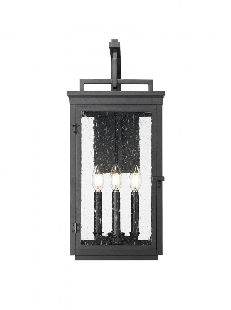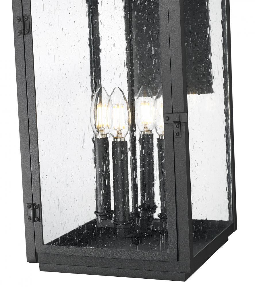 Wrapped in a sand black finish and topped with a stately handle, this outdoor light makes a dramatic statement from the very first glance. Clear seedy glass shimmers like storm-swept windows, casting a warm and welcoming glow. Inside, four candle-style lights bring classic charm to modern living. It feels both weathered and refined, like a story waiting to be told.