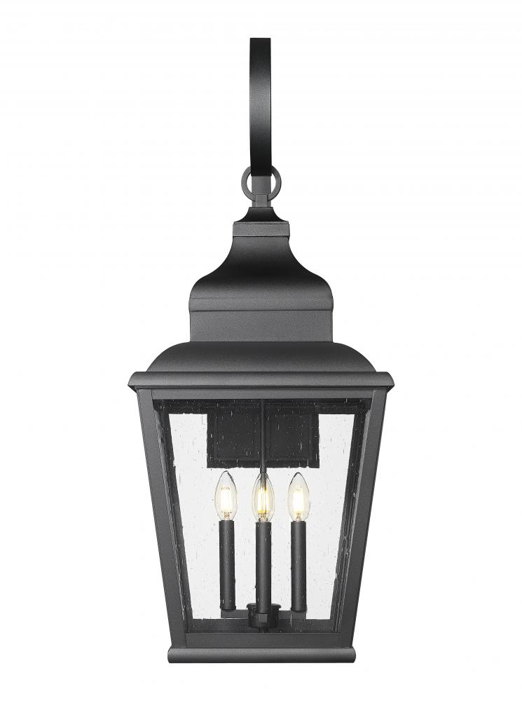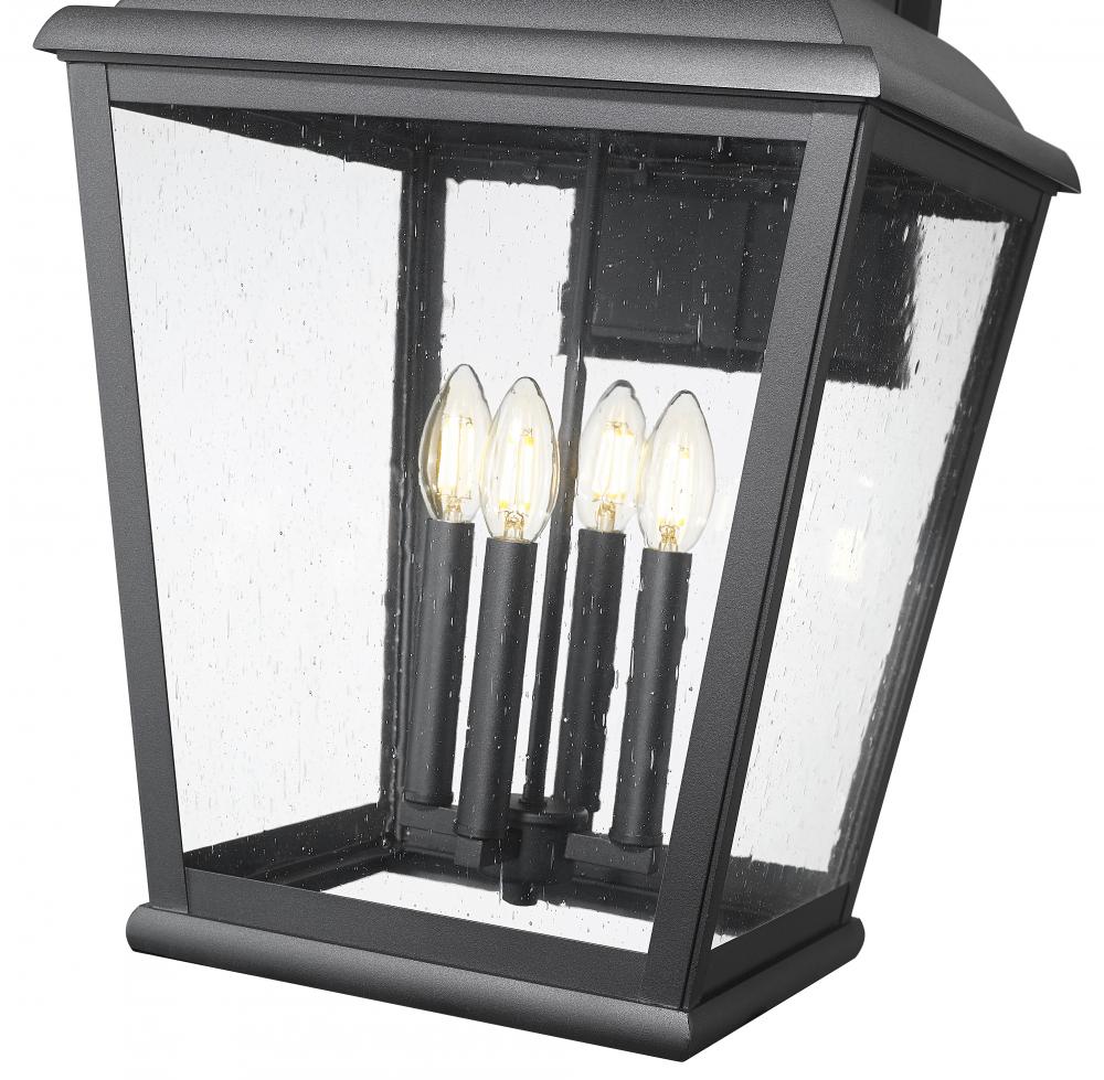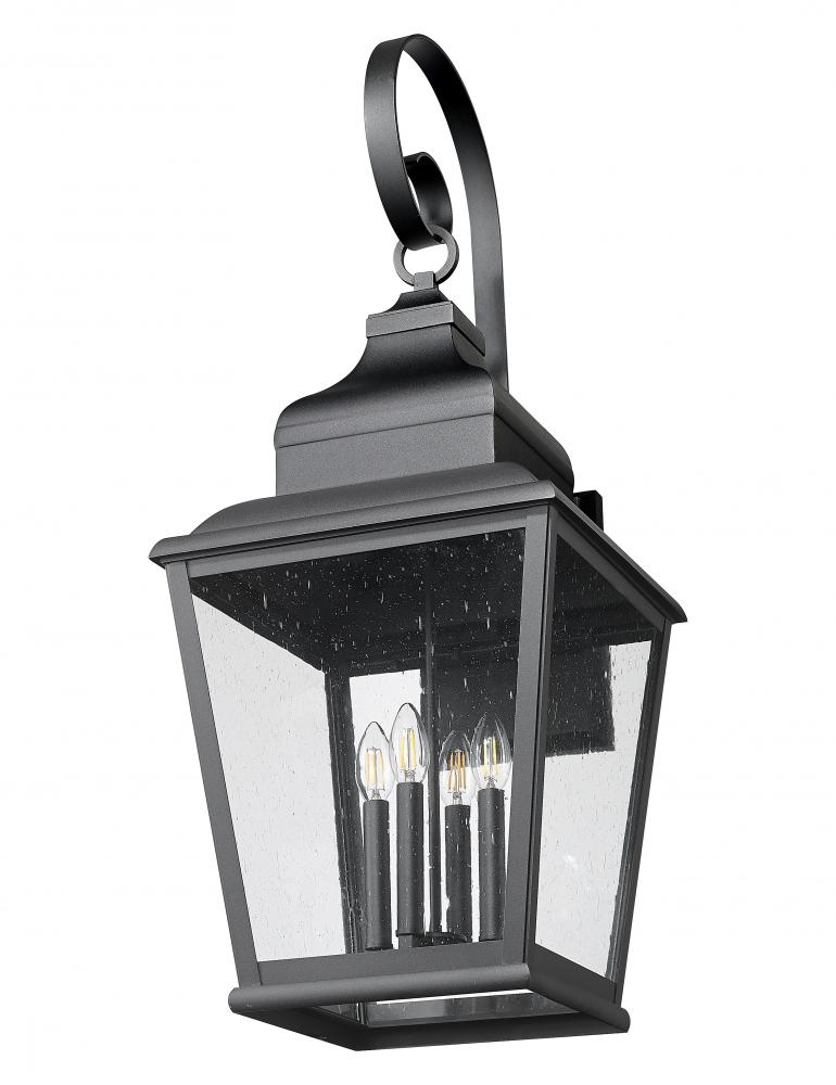 A charmingly curled arm joins multiple elegant detailing on this four-light outdoor wall light, an excellent illumination source for larger exterior spaces. Sand black finish aluminum framing creates a tapered lantern motif, as clear seedy glass panels reveal village-inspired candelabra bulb mounts. Choose dimming functions to customize delivery of lighting levels for mood and function.