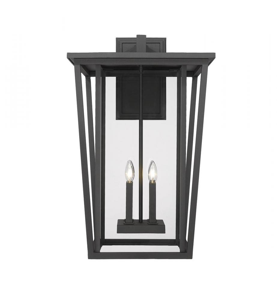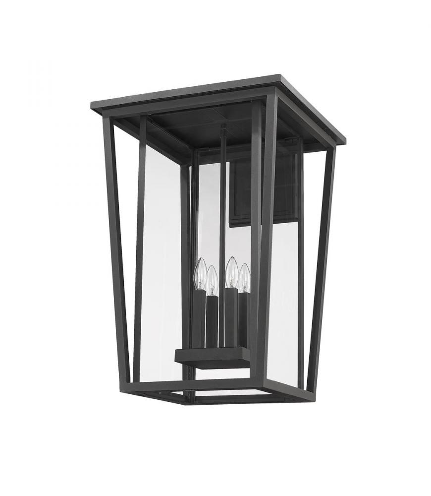 Illuminating a residential or business structure becomes a work of artistic, geometric design when this four-light outdoor wall sconce is mounted on any structure. This fixture from the Seoul collection reflects a balanced blend of contemporary and traditional, with a village-inspired housing unit featuring black finish aluminum construction. Specially cut clear glass panels offer both protective properties and a sleek view of a candelabra-style bulb base.