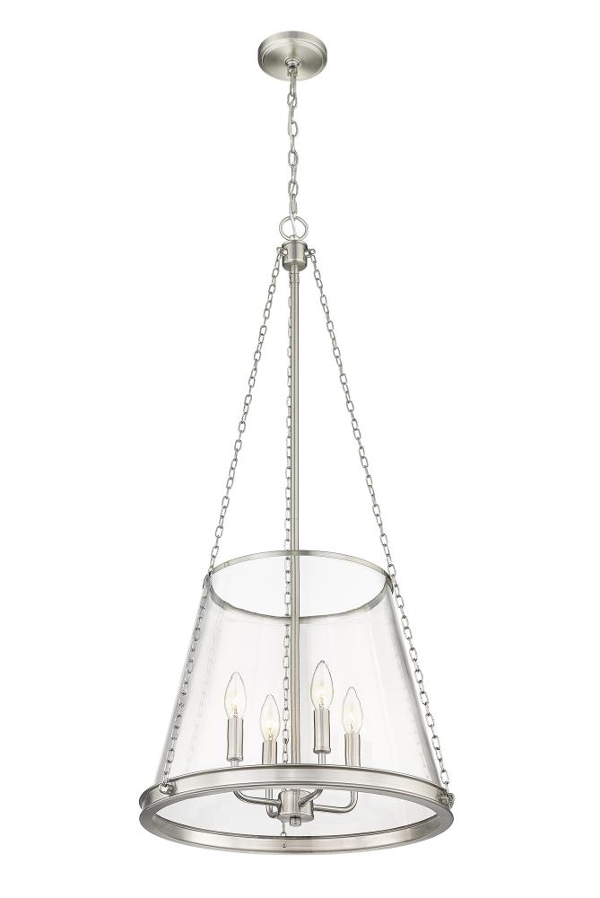 A contemporary take on an architectural restoration style classic, this transitional four-light pendant presents a shiny brushed nickel finish that offers an understated metallic accent to dining rooms and interior spaces. Perfect for spacious foyers and living rooms, this four-light pendant creates a breathtaking urban aesthetic and illuminates a space wonderfully with its four-arm candelabra style light that sits inside an elegantly tapered clear glass shade suspended by industrial style chain link supports.
