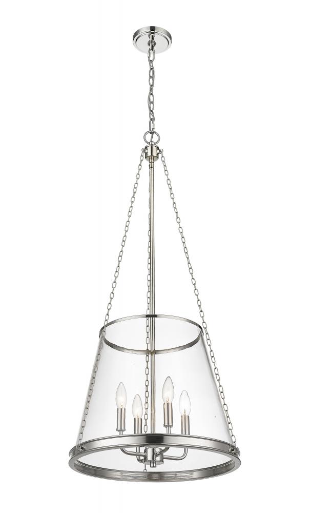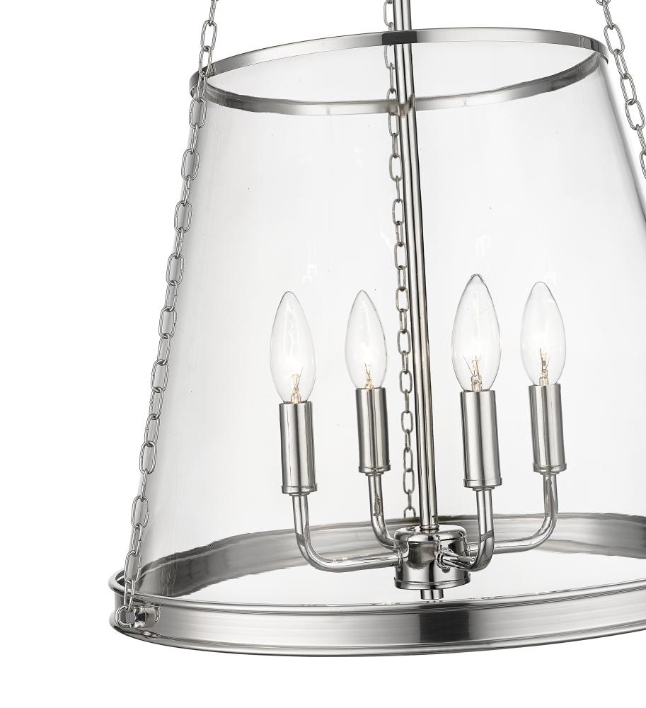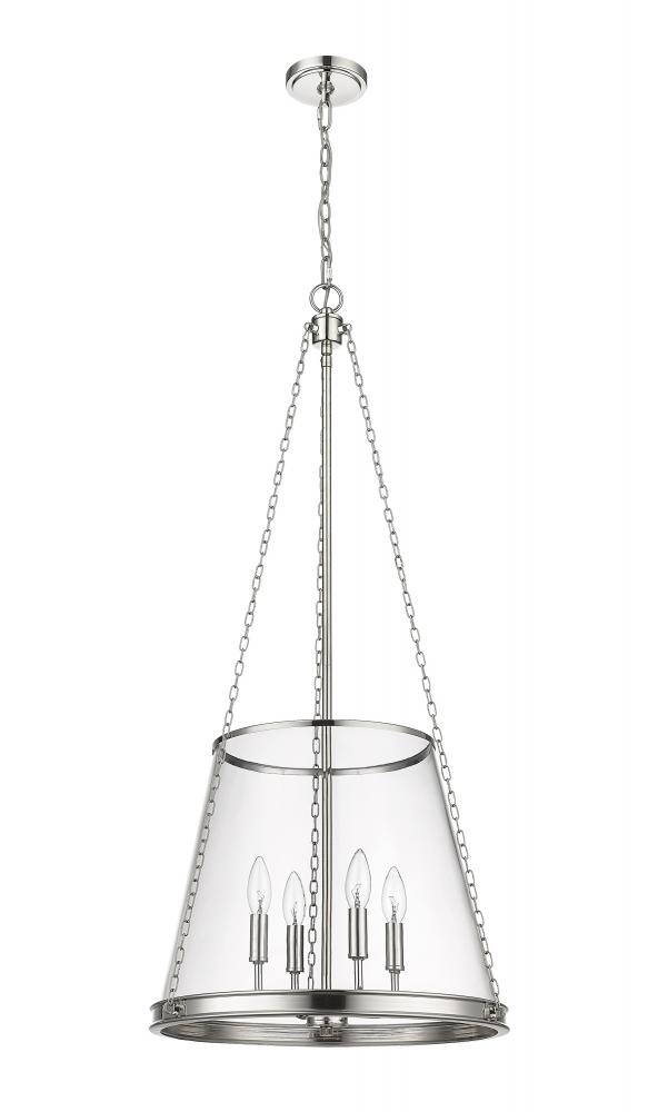 A contemporary take on an architectural restoration style classic, this transitional four-light pendant presents a lustrous polished nickel finish that offers a light metallic touch to dining rooms and interior spaces. Perfect for spacious foyers and living rooms, this gorgeous four-light pendant creates a sleek urban aesthetic and illuminates a space wonderfully with its four-arm candelabra style light that sits inside an elegantly tapered clear glass shade suspended by industrial style chain link supports.