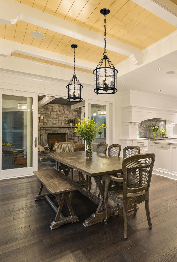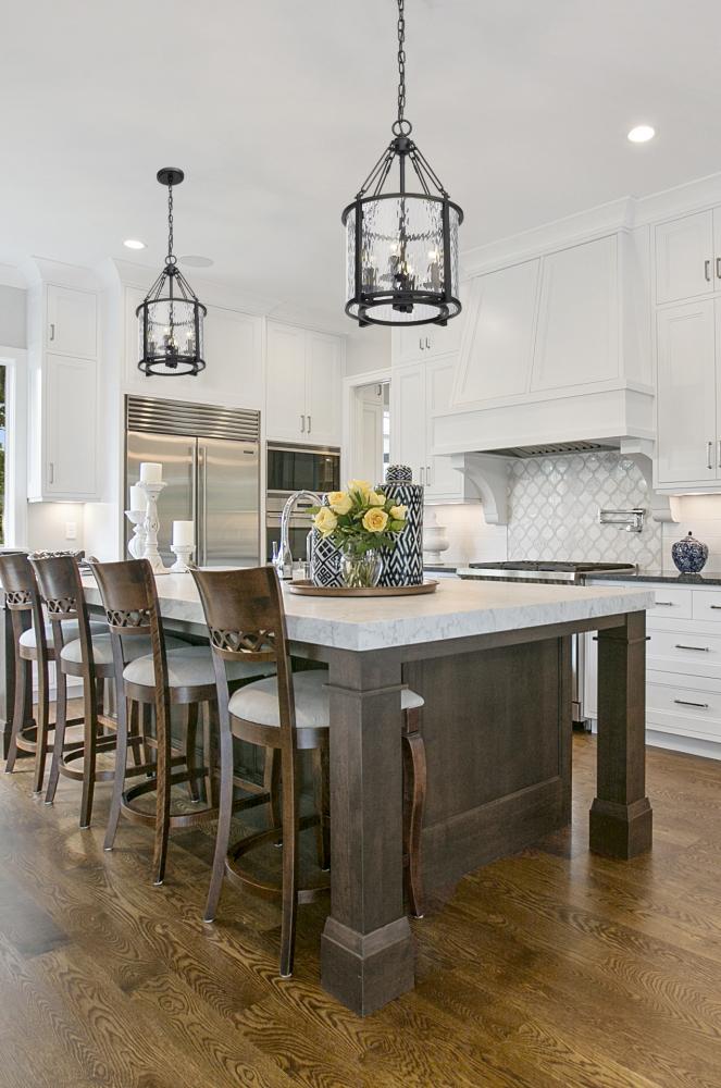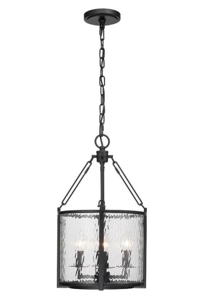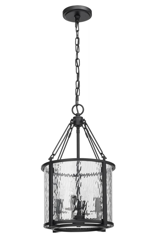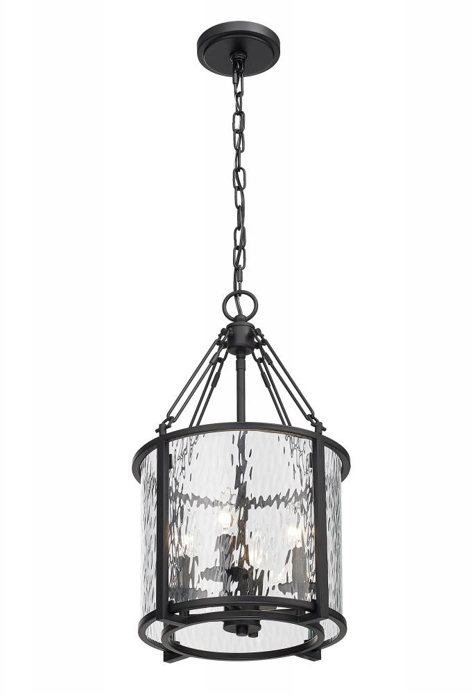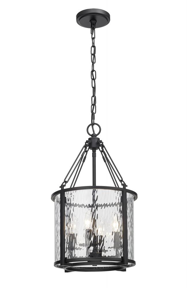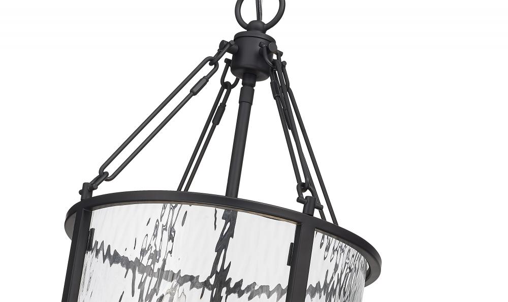 Absorb the romantic impact of a waterglass shade that shapes a dramatic mood and exceptional beauty in a fixture styled to impress. This four-light pendant from the Barrington collection is designed around an enticing energy and an industrial motif with a round cage made of matte black finish steel framing waterglass that distorts a view of romantic candelabra bulbs creating a castle-inspired look.