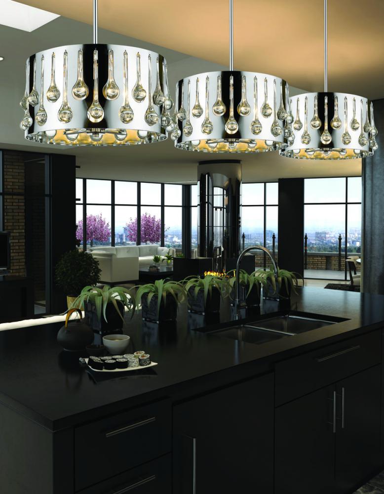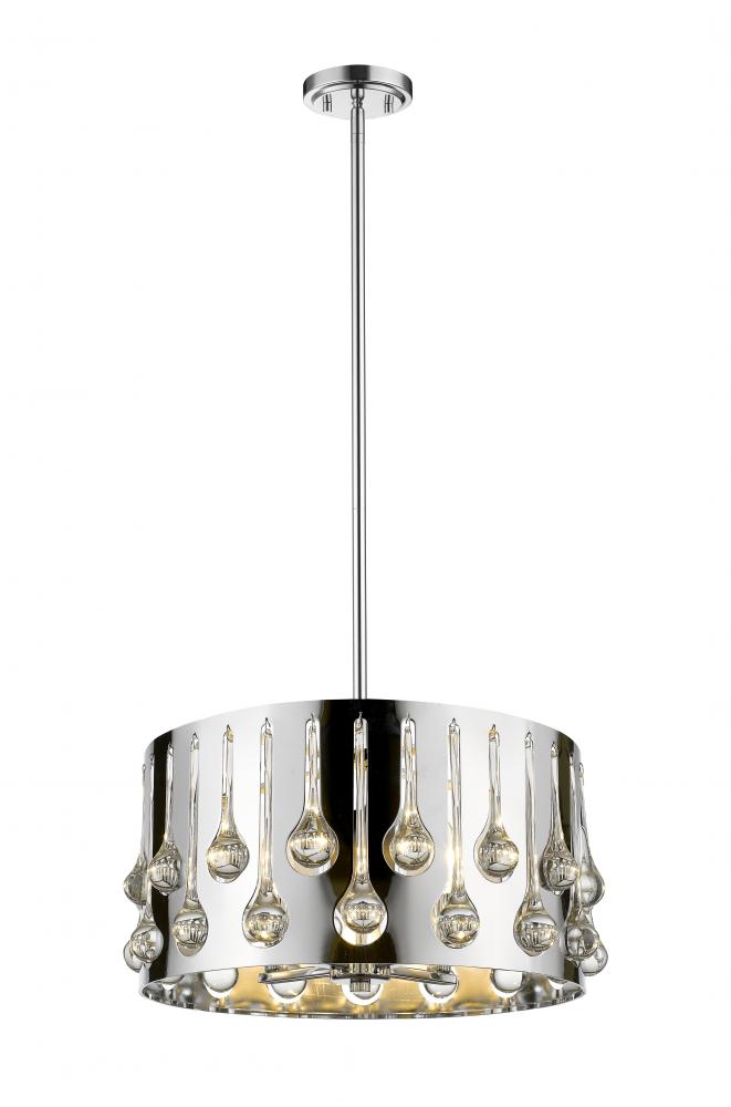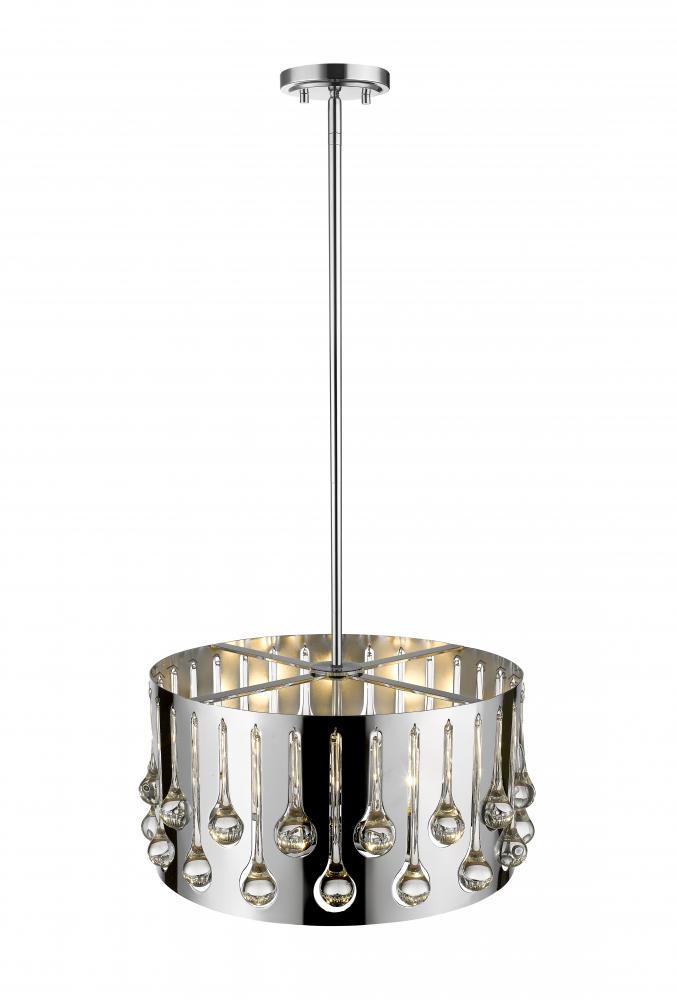 Artistic elegance and a glam vibe are in full supply with this four-light pendant. Sleek, shiny chrome finish steel forms a round base dressed up with droplets of crystal, offering a sensual and dynamic contemporary appeal.
