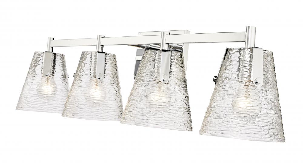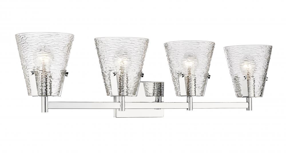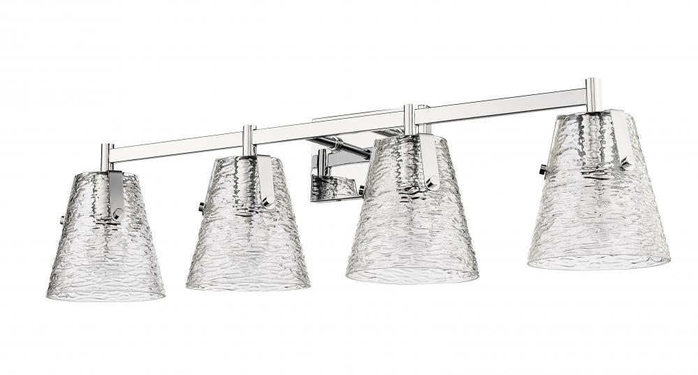 Energize a custom modern bath space with this four-light vanity bath light, embracing the radiant look of hand-blown clear textured glass. Ideal for both contemporary or transitional spaces, this vanity light from the Analia collection merges a hint of nautical style with conical shades and industrial-inspired details. A brilliant chrome finish steel frame reflects a minimalist style with glam and elegance.