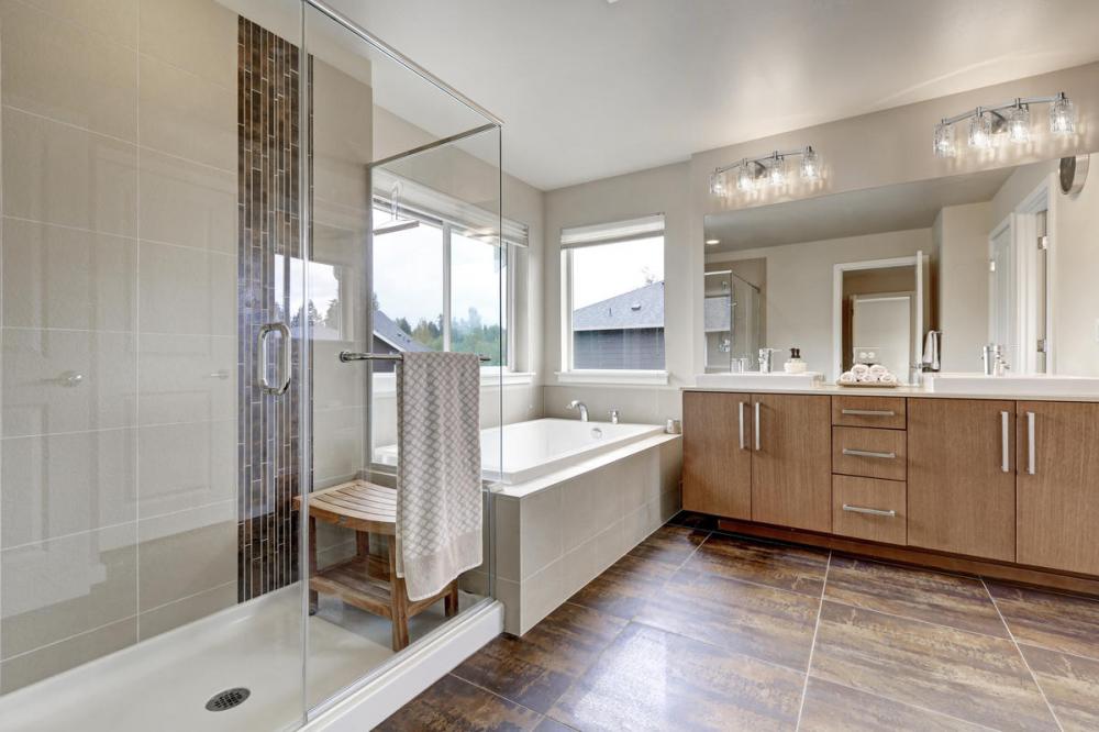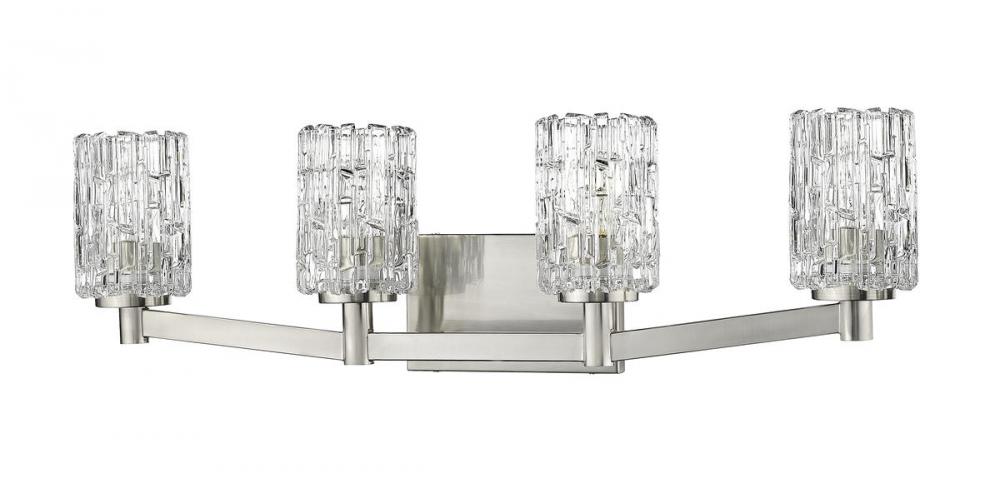 A contemporary haven is bejeweled with glam as this exquisite four-light vanity light becomes a focal point in a custom bath space. Crystal-like glass shades add an air of exclusivity to a fixture with a beautiful Brushed Nickel finish metal mount and arms, and an air of high-class, upscale elegance to frame a master or guest vanity.