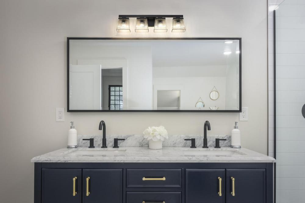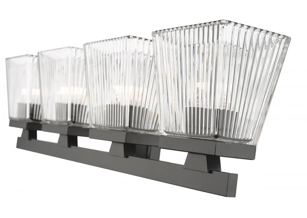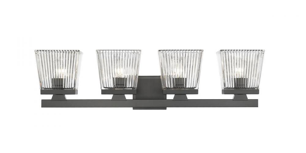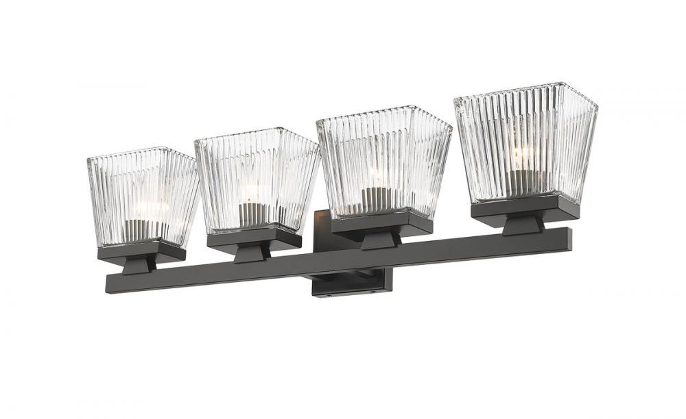 This four-light vanity light in matte black is the perfect piece for your modern farmhouse bathroom or hallway. Clear glass shades with a ribbed texture adds visual interest to the silhouette.