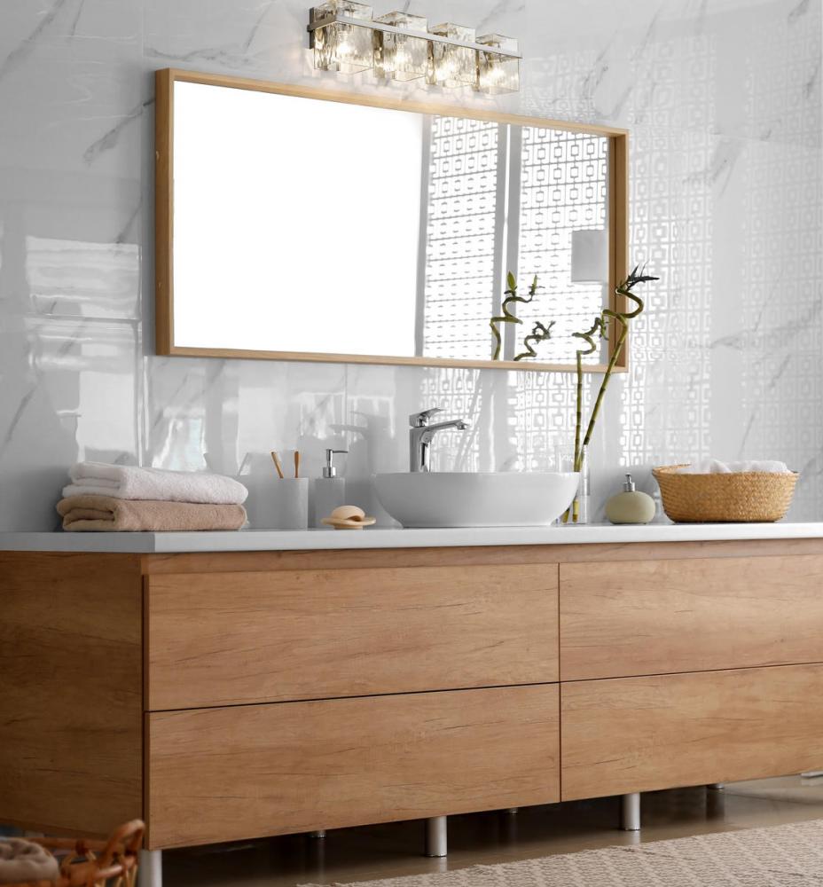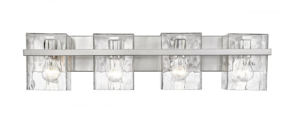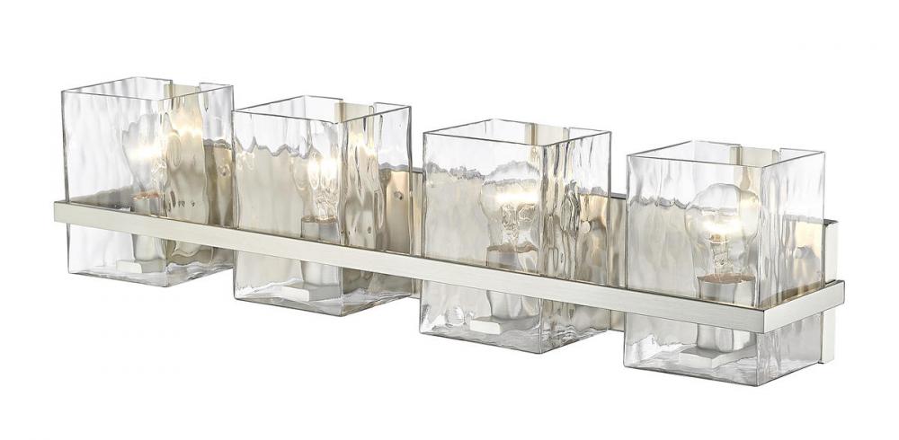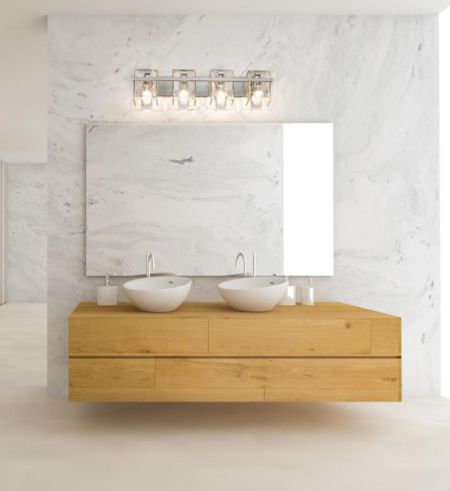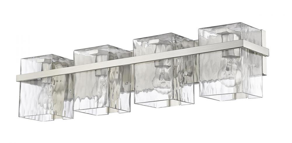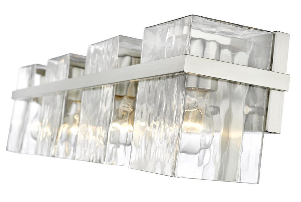 This four-light vanity light with clear glass shades brings a sophisticated expression for your bathroom lighting. Rippled shades provide an eye-catching texture while the steel construction is finished in brushed nickel.