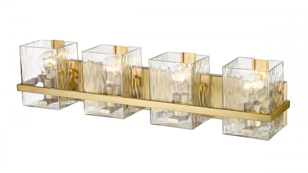 This four-light vanity light with clear glass shades brings a sophisticated expression for your bathroom lighting. Rippled shades provide an eye-catching texture while the steel construction is finished in modern gold.