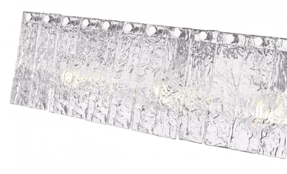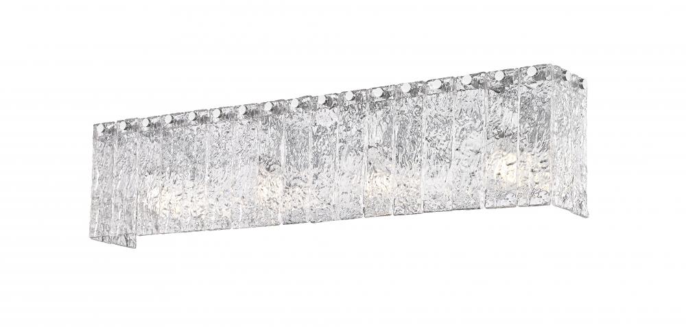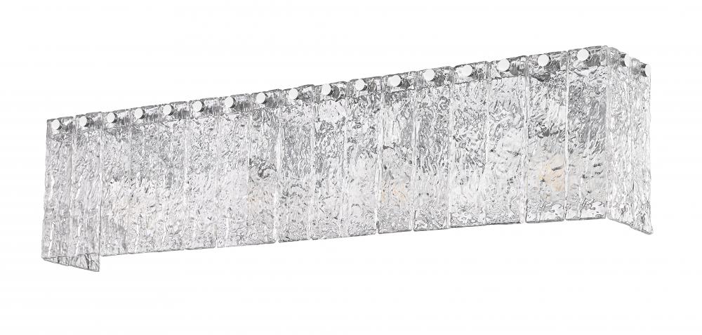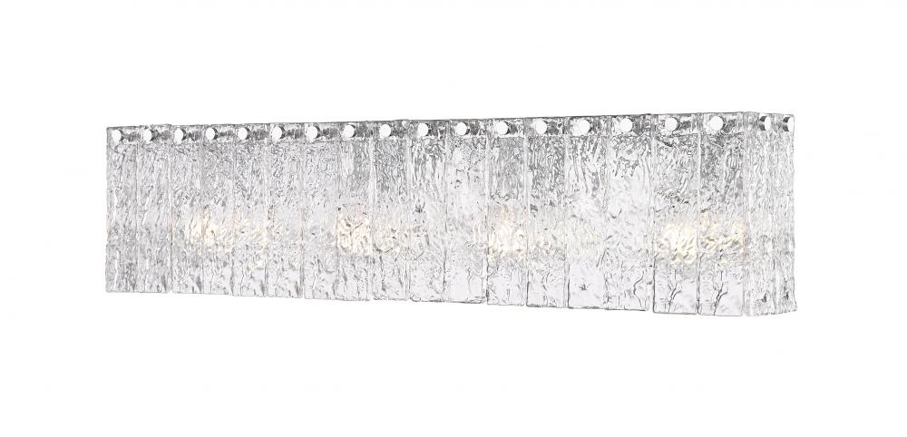 Unlock radiant sophistication in your stunning en suite with a modern four-light vanity bath light. Its durable steel frame received a chrome finish, adding gleaming flair with understated appeal. Vertical panels of textured glass bring icy elegance and character, perfect for dimension in a sophisticated home.