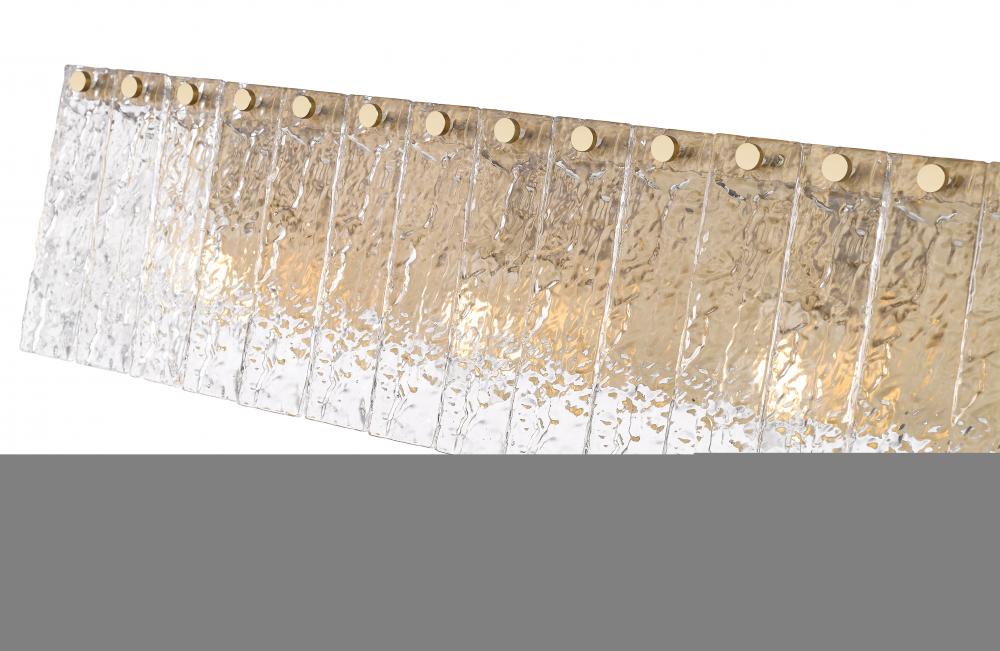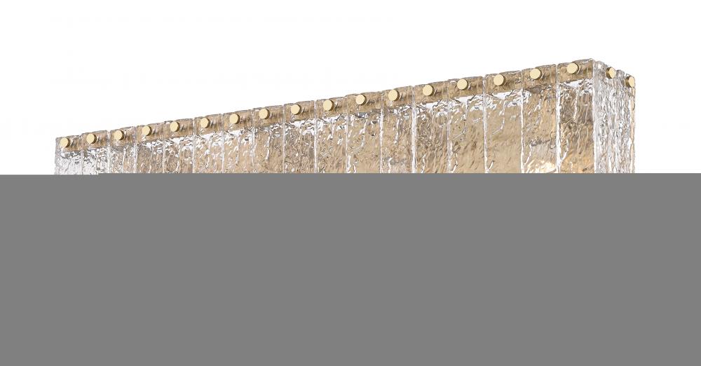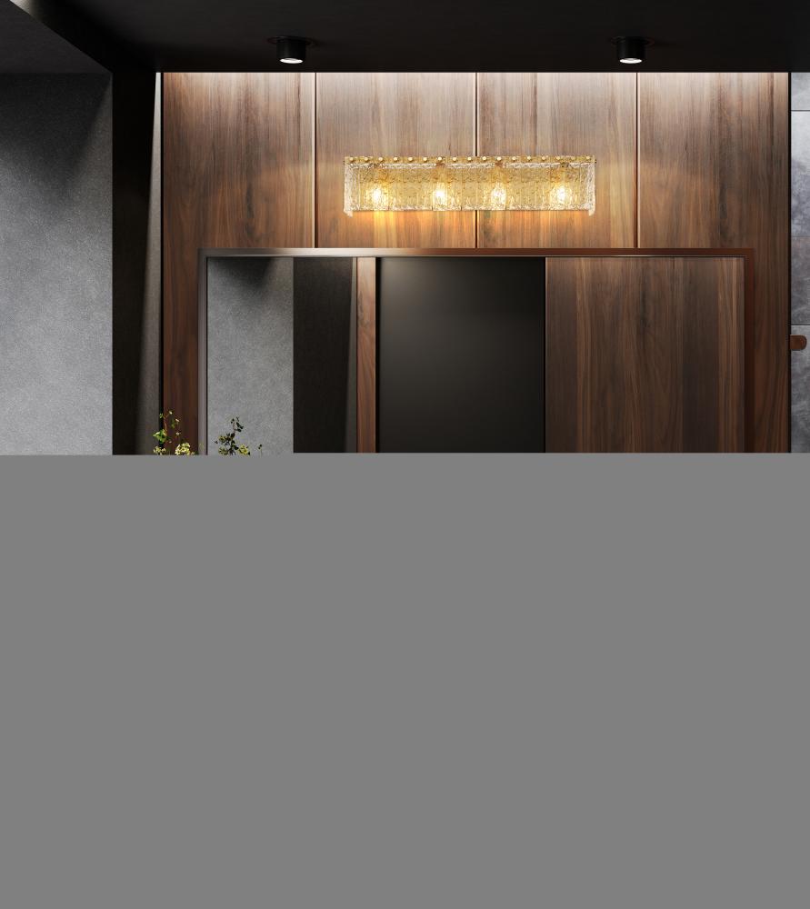 Modern radiance abounds in a striking contemporary four-light vanity bath light. A bold centerpiece over your vanity, it boasts a durable steel frame with minimalist presence and a warm modern gold finish. Icy panels of clear textured glass capture attention and ensure beautiful dimension and depth.