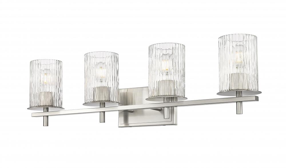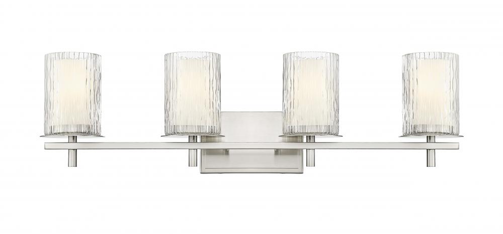 Bring an updated contemporary vibe with layering and linear elements, choosing this four-light bath vanity light. Intricate detail is textural and artisan with clear glasswork in a cylinder shape, with an inner white diffuser. Etched opal and clear glass blend as they enhance cool brushed nickel finish framing and show off a crisp mix of circles and lines.