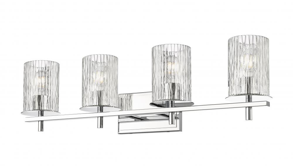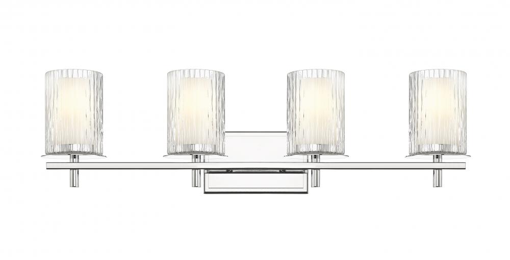 Make a statement in a modern bath space with this glam-inspired and timeless four-light vanity light. Intricate detail is textural and artisan with clear glasswork in a cylinder shape, with an inner white diffuser. Etched opal and clear glass blend as they enhance brilliant chrome finish framing and show off a crisp mix of circles and lines.