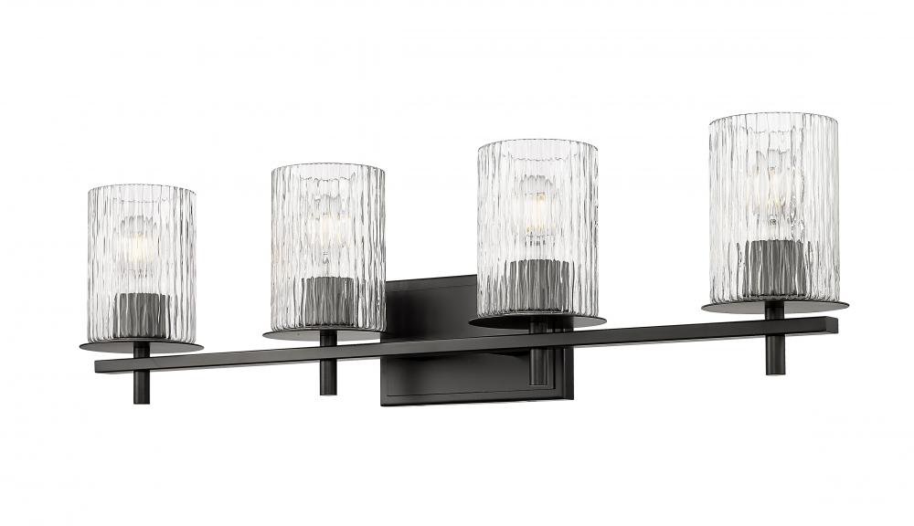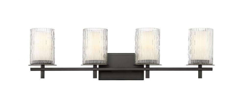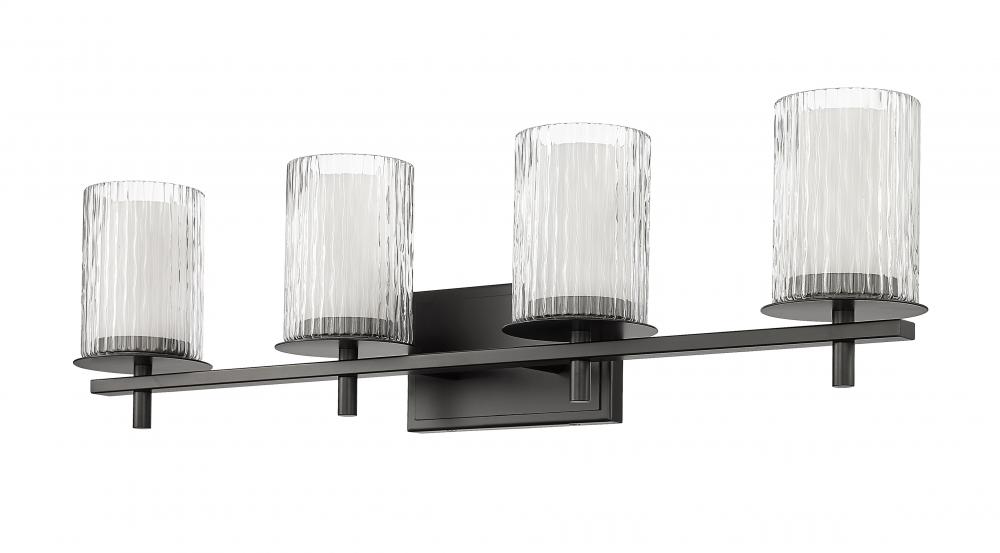 Iconic glass and metal construction makes an impact in contemporary space as this four-light vanity light sets itself apart. Intricate detail is textural and artisan with clear glasswork in a cylinder shape, with an inner white diffuser. Etched opal and clear glass blend as they enhance bold matte black finish framing and show off a crisp mix of circles and lines.