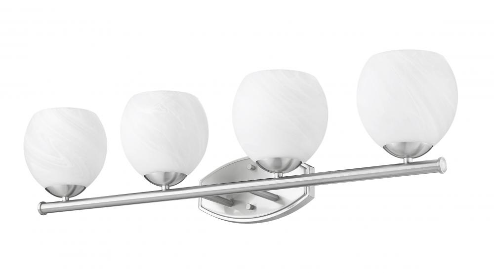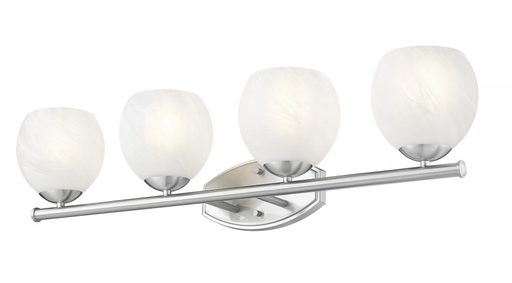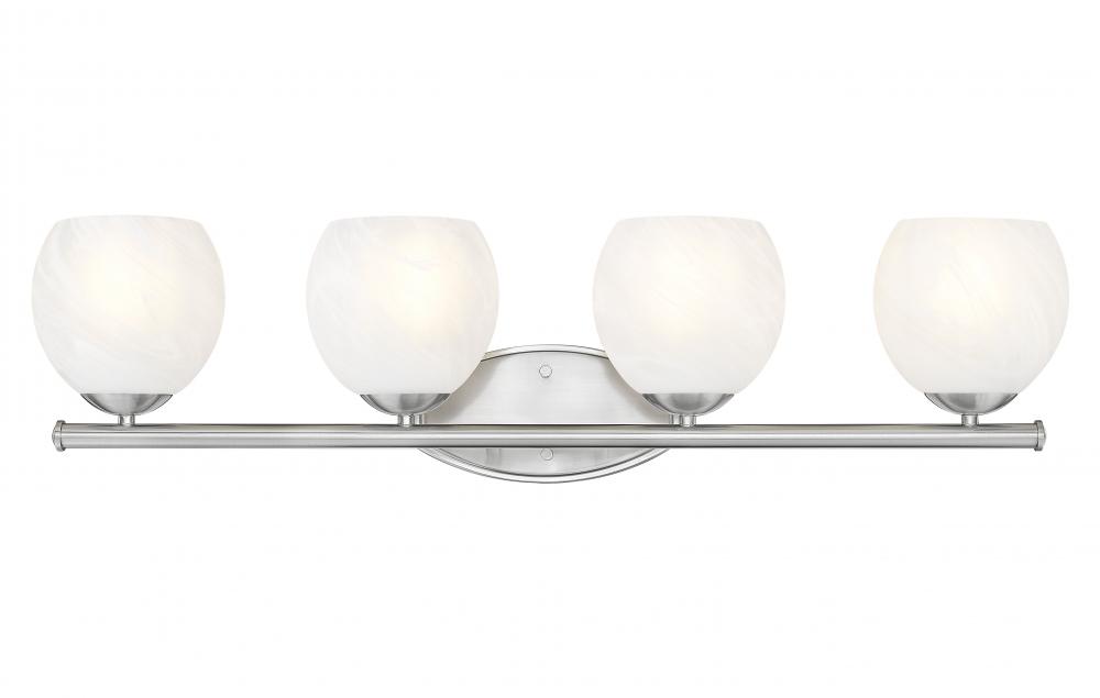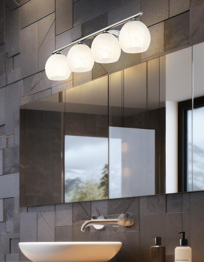 Robust glass shades cast bright, flattering illumination from this transitional four-light vanity bath fixture. Precise design radiates elegance and timeless character, pairing the feathered opaque white swirl glass with a soothing brushed nickel frame finish. From the Colette collection, the fixture evokes fresh refinement, perfect for primary and guest suites, alike.