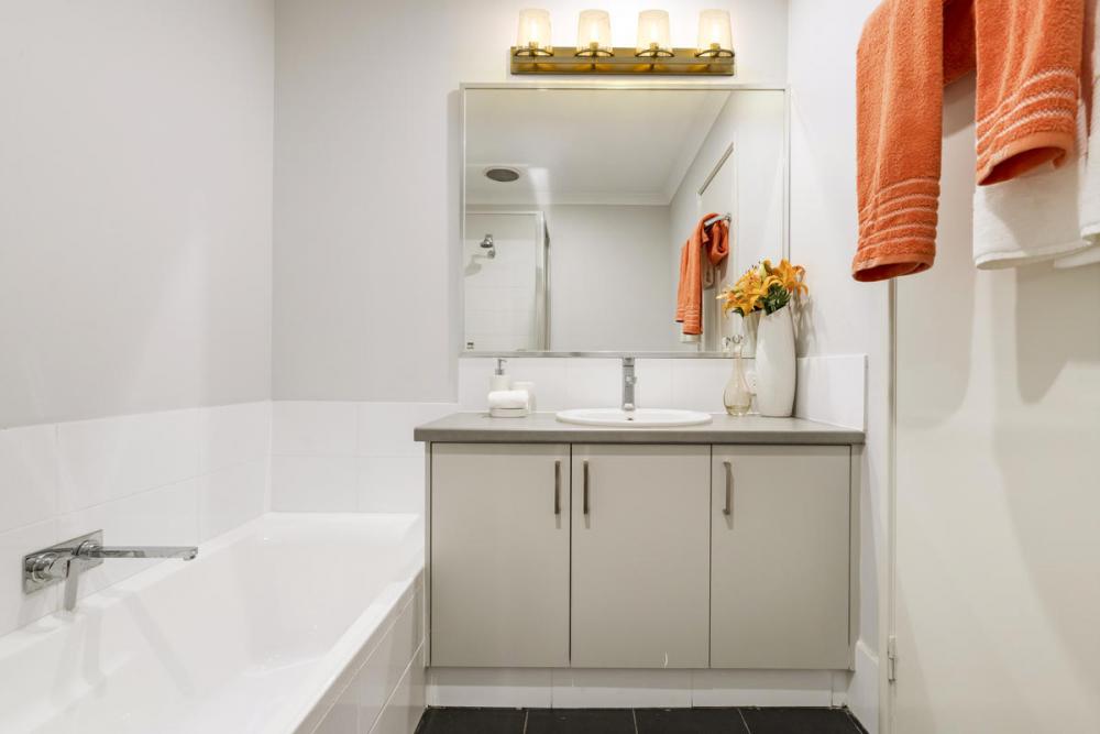 Rich in modern character, this elegant, rubbed brass vanity light brings a bathroom together in style. This four-light fixture features clear glass shades for a brilliant and luminous glow.