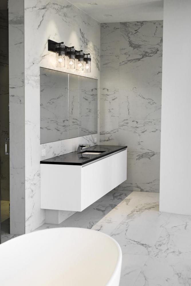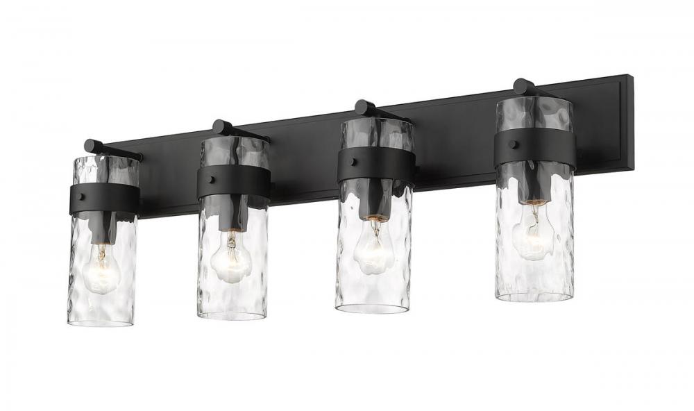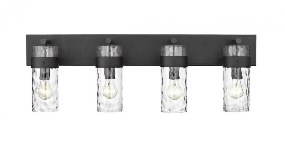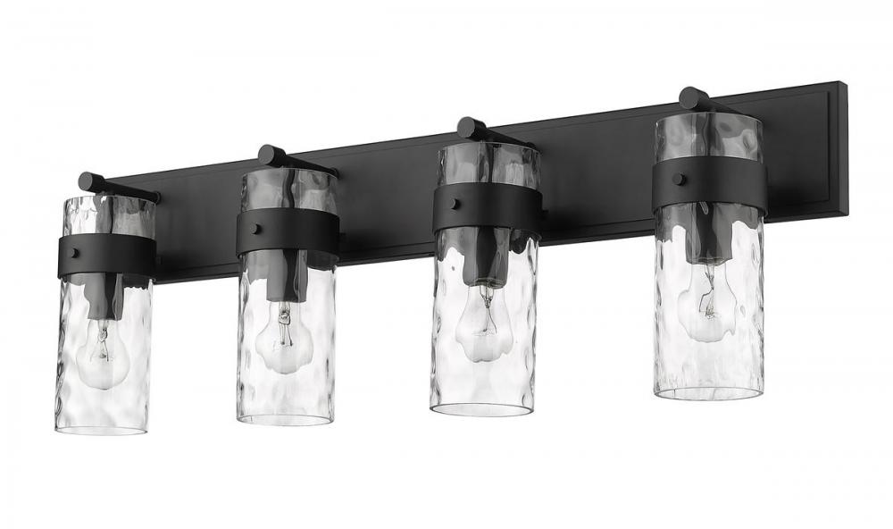 Deliver a sophisticated appearance in hallways and bathrooms with a four-way vanity fixture in matte black. The rippled texture of the glass shade provides a romantic ambiance, while the cylindrical shape offers an alluring appeal.