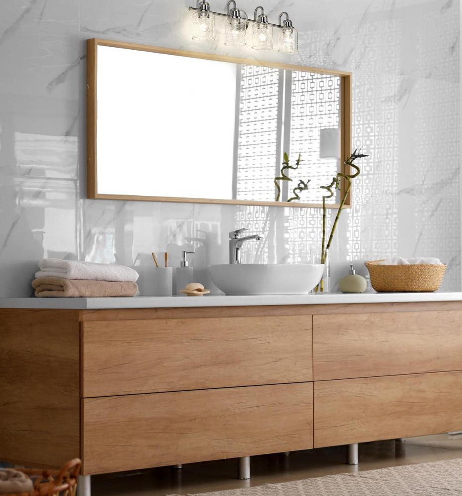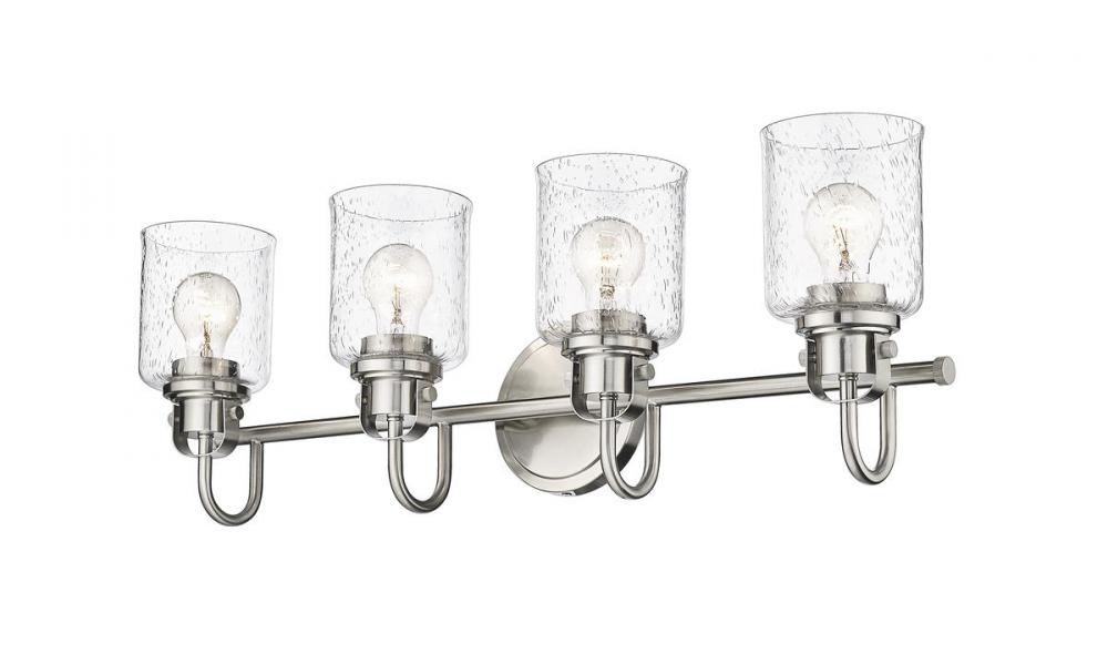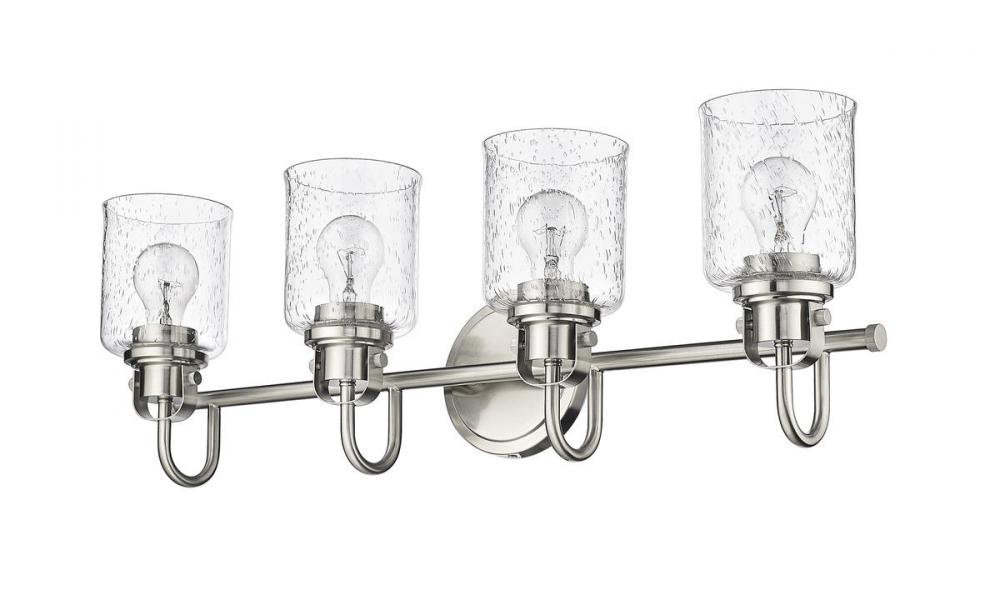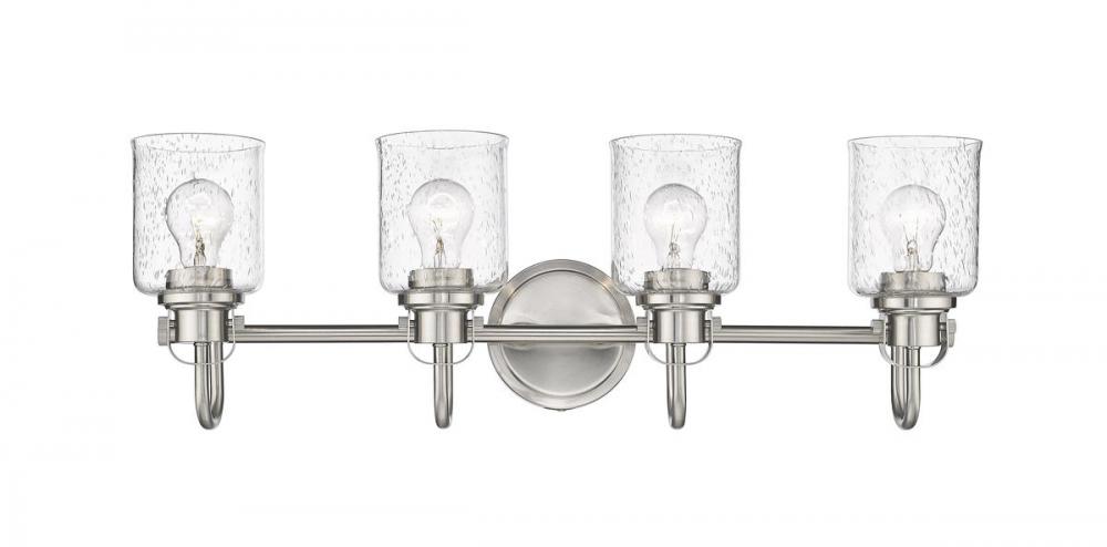 This four-light vanity fixture in brushed nickel provides a playful way to include metropolitan style to your hallway, bathroom, or bedroom. The cylindrical shade with a seeded glass top is made of steel, offering an ambient glow.