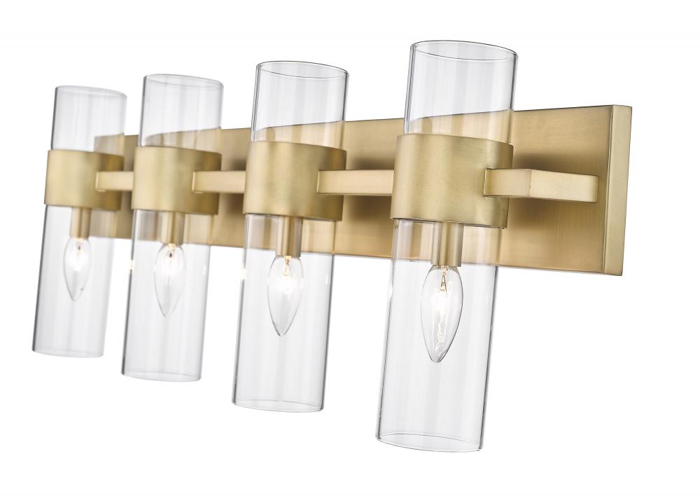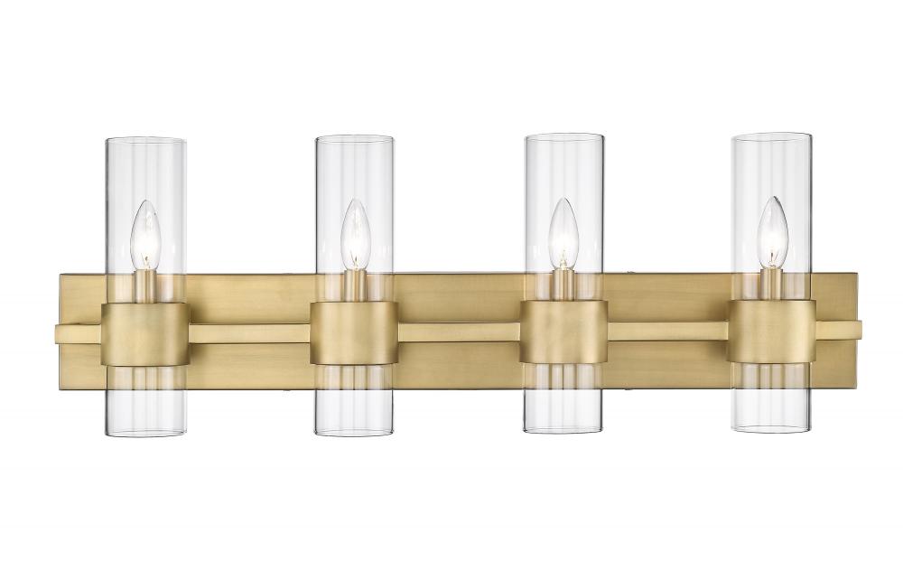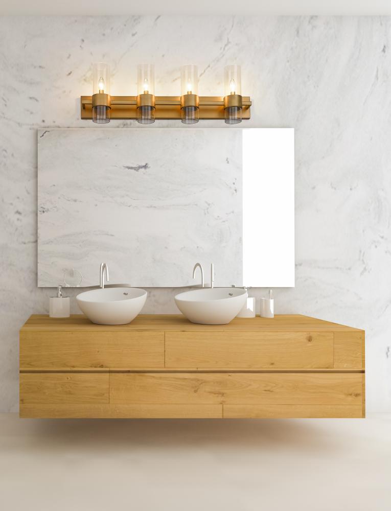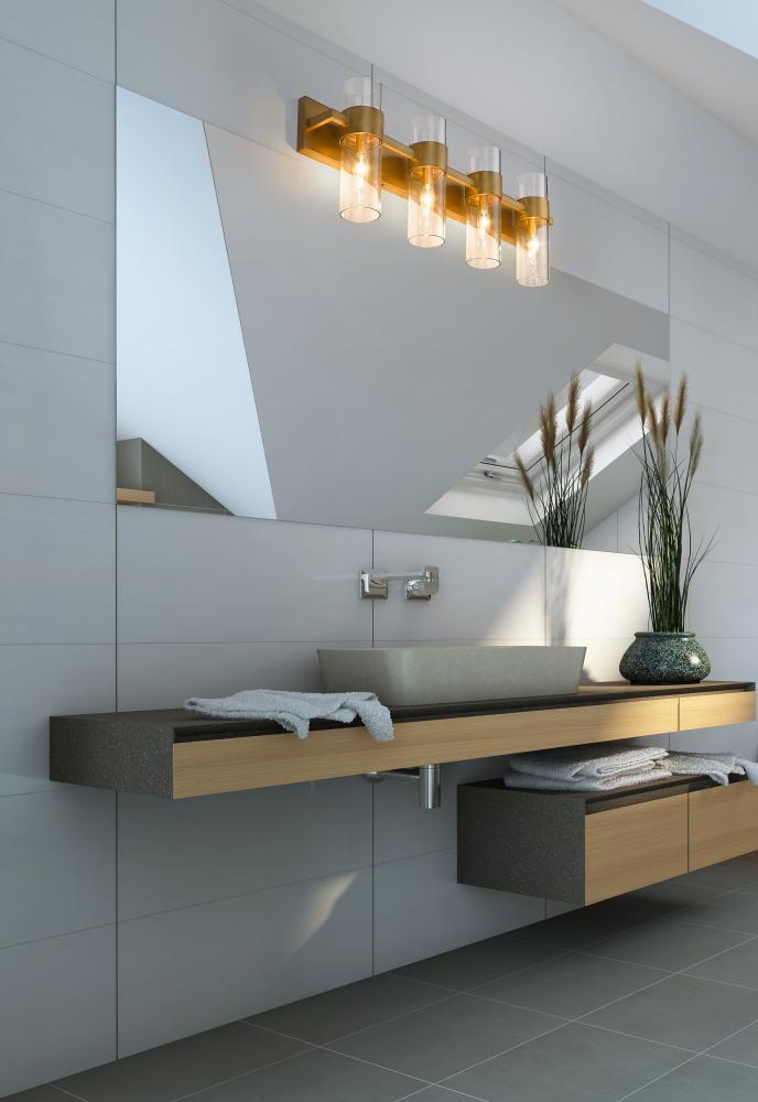 Create a chic minimalist expression with this linear contemporary vanity light, transforming en suite bathroom retreats into a tastefully adorned dressing area. This four-light vanity fixture presents an elongated steel plate in a warm rubbed brass finish that suspends four lantern-like clear glass cylinder shades held in place by a wide band in the same finish, creating a luxe metallic touch to a bathroom space. Match existing bathroom hardware and fixtures effortlessly and illuminate the space with this stunning and sophisticated modern vanity light, placing it over a spacious countertop or full-length wall mirror.