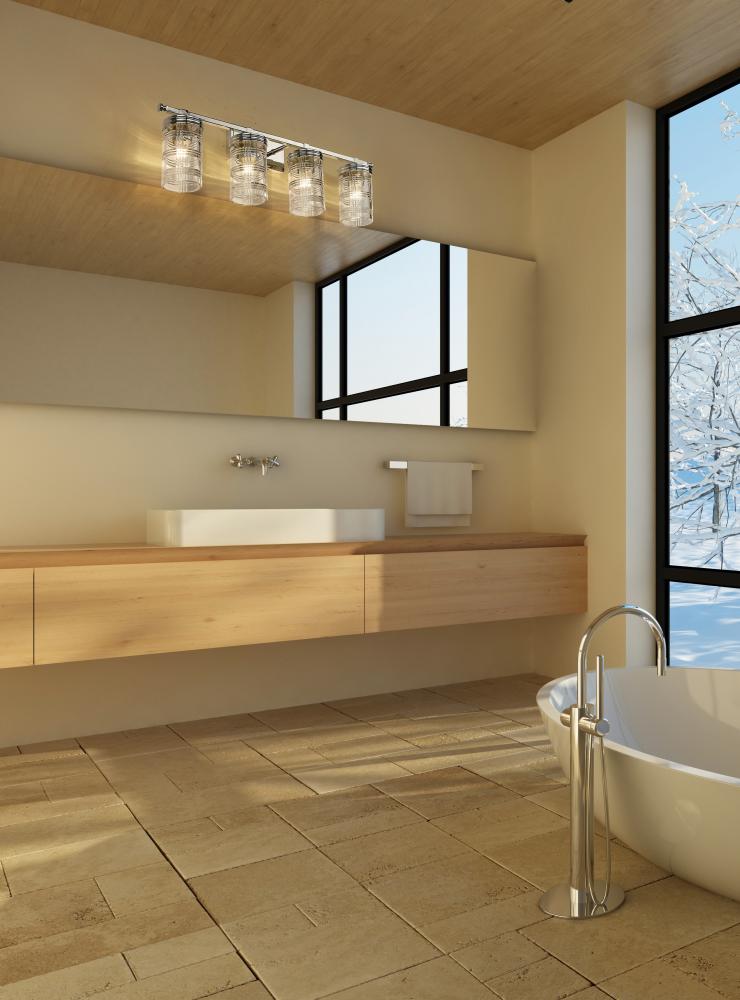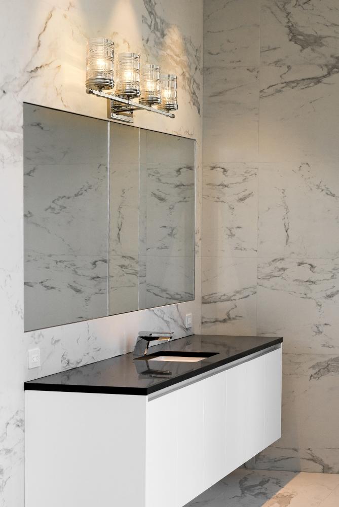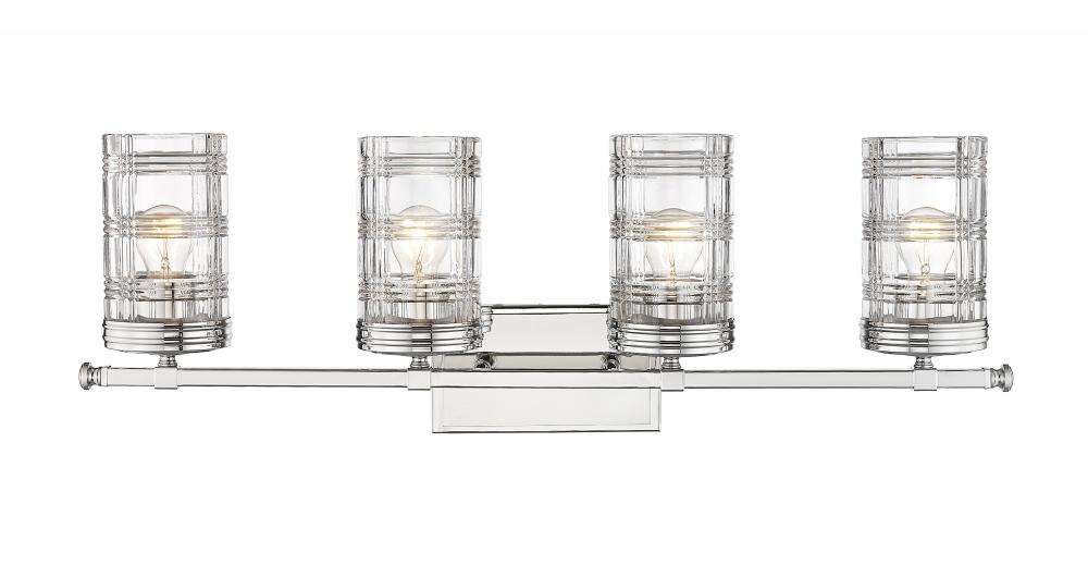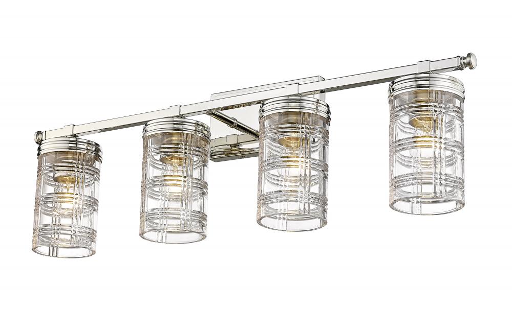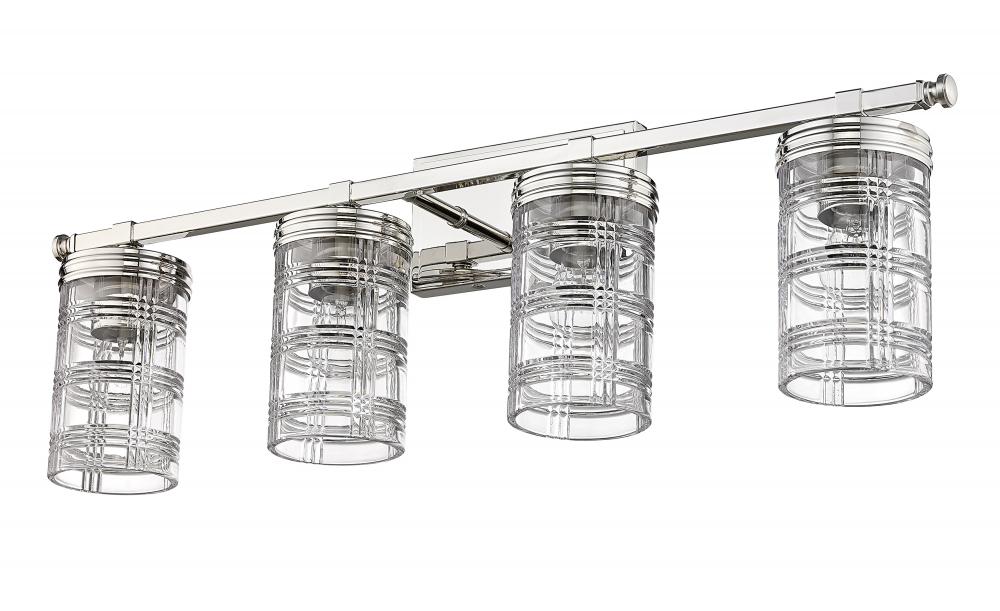Create a classical-designed master bathroom with this sophisticated transitional four-light vanity wall sconce. Four cut crystal-inspired cylinder glass shades elevate vanities into an old-world restoration-inspired dressing area, elevated by a charming Glen plaid pattern around the glass that creates a glowing scintillation. A shiny polished nickel finish pushes the metropolitan glam feel to a bathroom interior, making this four-light vanity fixture a stunning addition to spacious vanities and tablescapes.