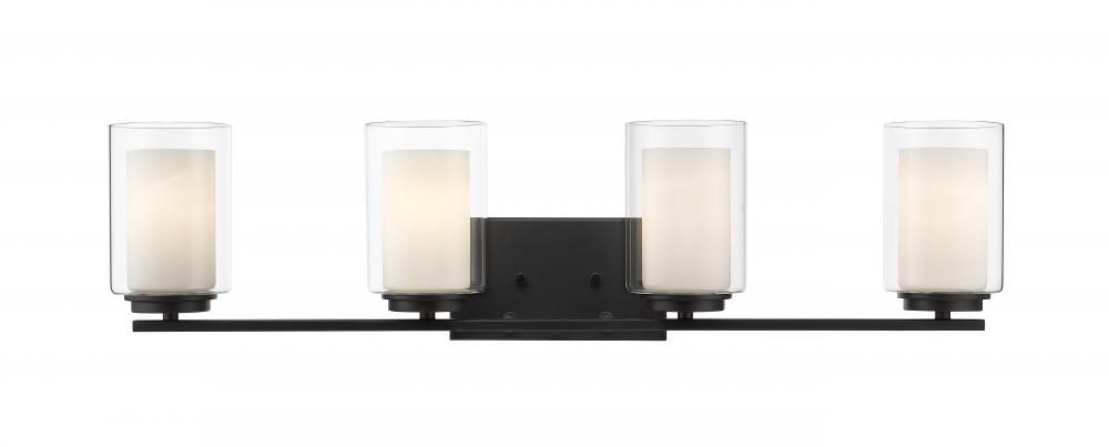 Give your powder room a chic, sophisticated update. This beautiful, matte black vanity light features four glowing bulbs beneath four delicate, glass shades that are matte opal on the inside and clear on the outside. An exquisite lighting option to highlight your refined sense of style.