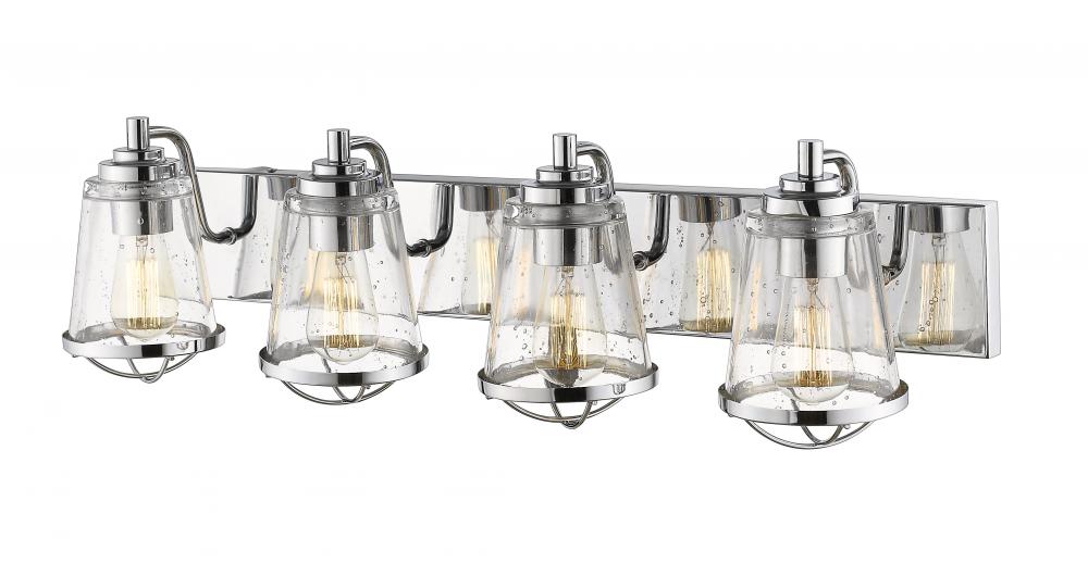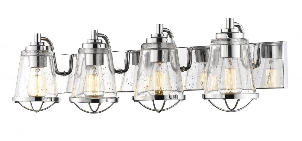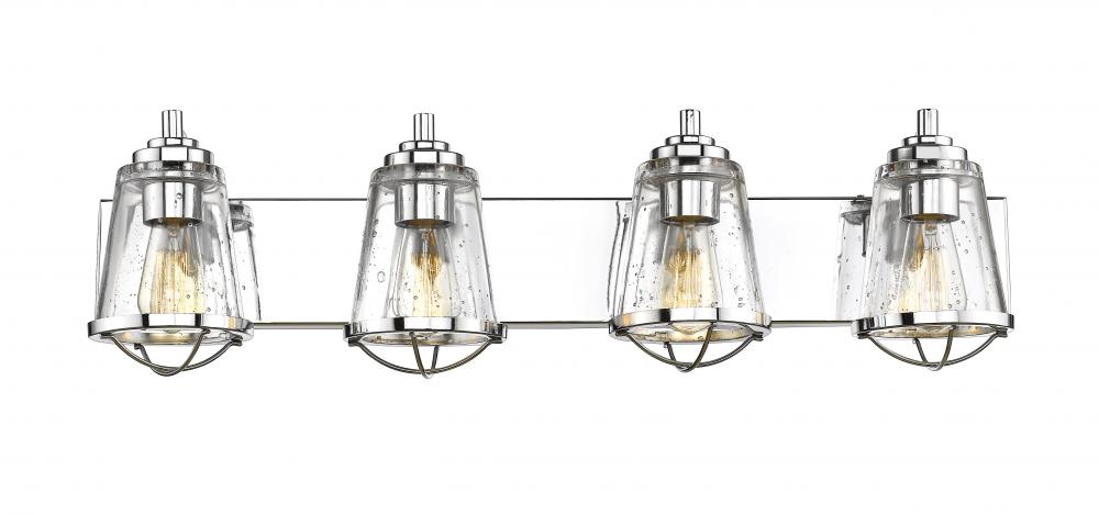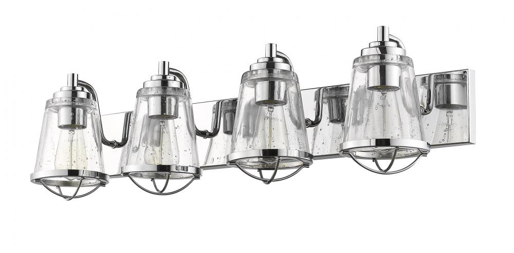 Borrowing from a beloved nautical motif, the uplifting style of this four-light vanity fixture becomes an integral part of a master or guest bath design scheme. Luscious, shiny chrome metal provides a mount and ornate trim detailing for conical shades made from texture-rich seedy glass.