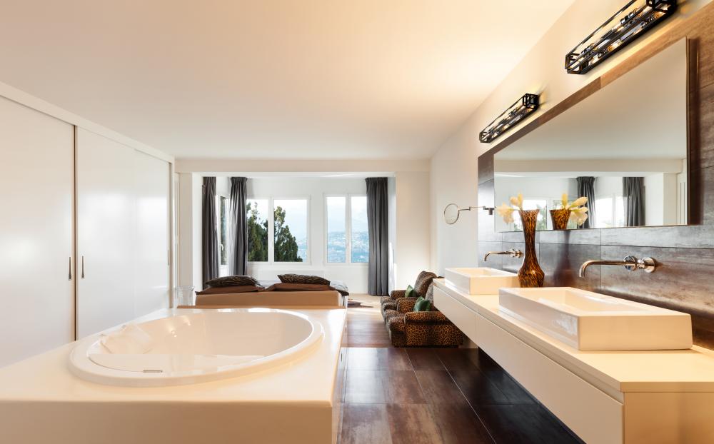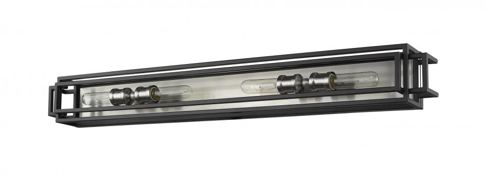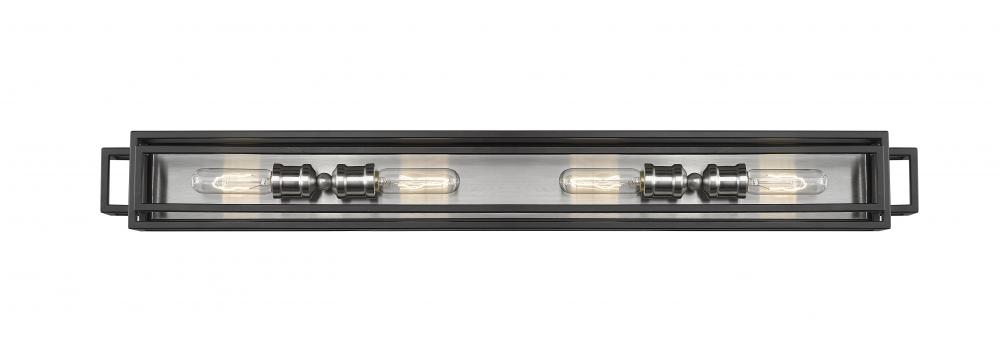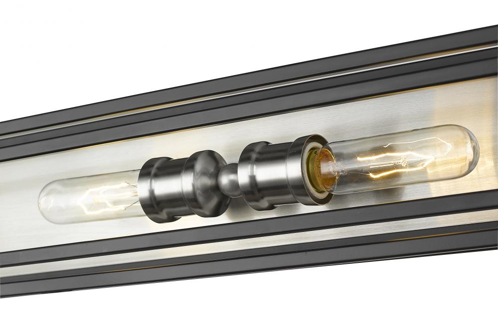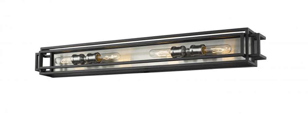 Exquisitely crafted with bold, black lines surrounding a gleaming, brushed nickel frame, this four-light vanity will illuminate your home in style. This handsome fixture looks especially elegant when placed over a bathroom mirror.