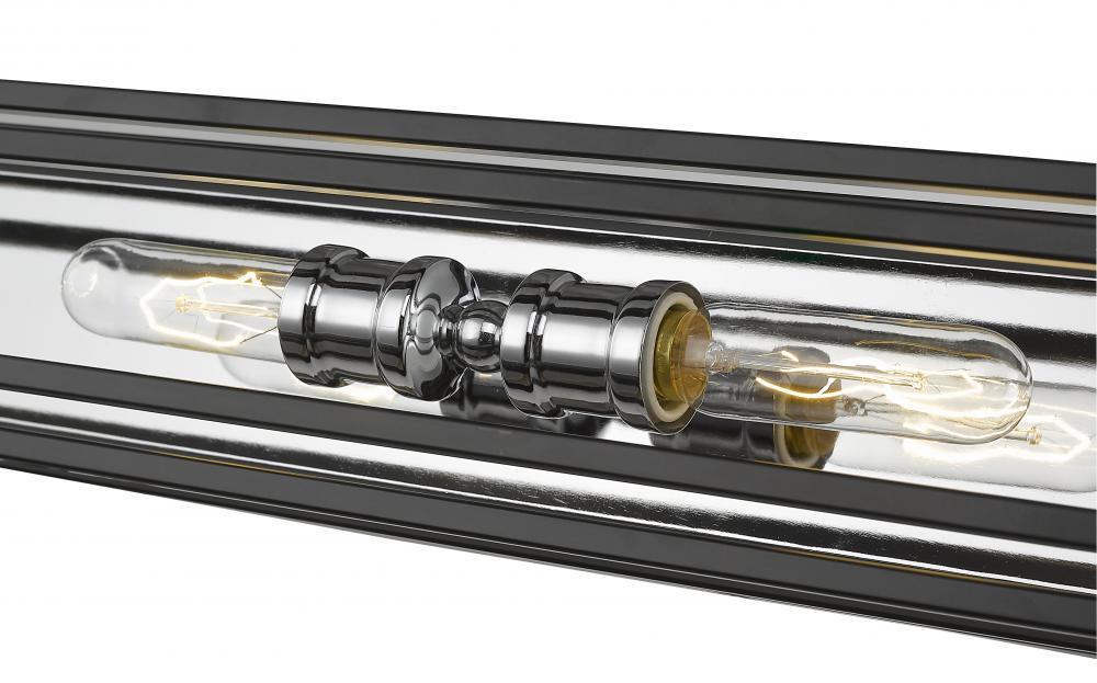 Exquisitely crafted with bold, black lines surrounding a gleaming, chrome frame, this four-light vanity will illuminate your home in style. This handsome fixture looks especially elegant when placed over a bathroom mirror.