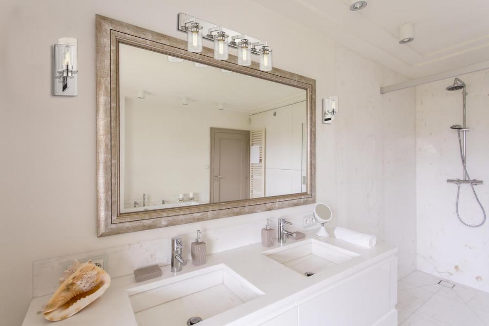 Bring a bold contemporary style to a modern bathroom with this mid-century modern four-light vanity. A stunning chrome finish underscores the luminous clear glass shades.