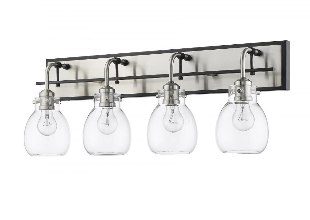 With a combination of finish styles, this four-light bath light transforms spaces with modern elegance. Tones of matte black and brushed nickel marry to create a bold visual.