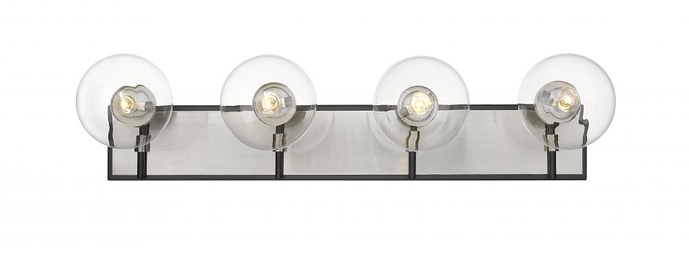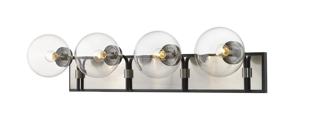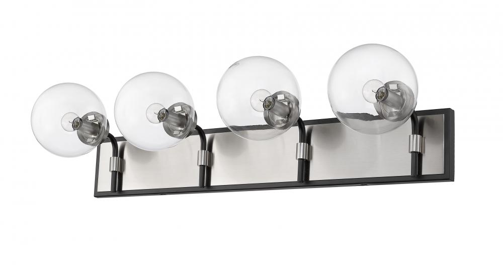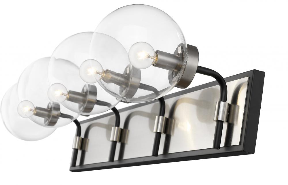Transform the look of your home with this clean, crisp four-light vanity. Its crafted with a matte black and brushed nickel finish and clear glass shades that deliver plenty of radiance. Youll love how its a perfect fit for a master bathroom or powder room with its mix of modern glam and edginess.