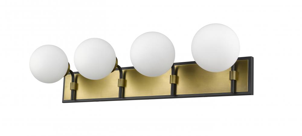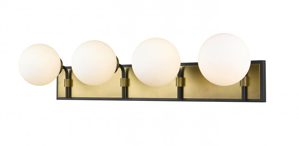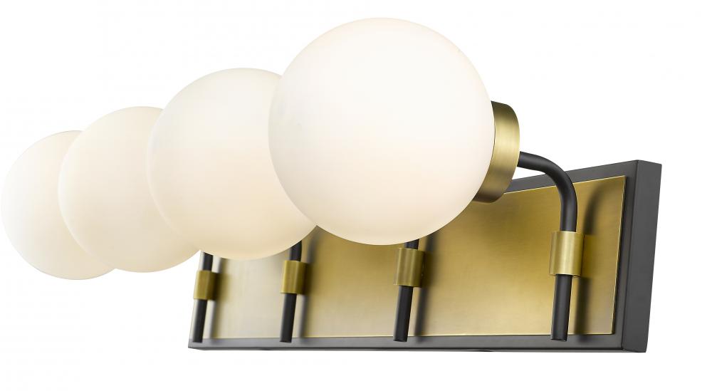 Transform the look of your home with this gorgeous four-light vanity. Its crafted with a matte black and olde brass finish and opal shades that deliver a warm radiance. Youll love how its a perfect fit for a master bathroom or powder room with its mix modern panache and old school lines.